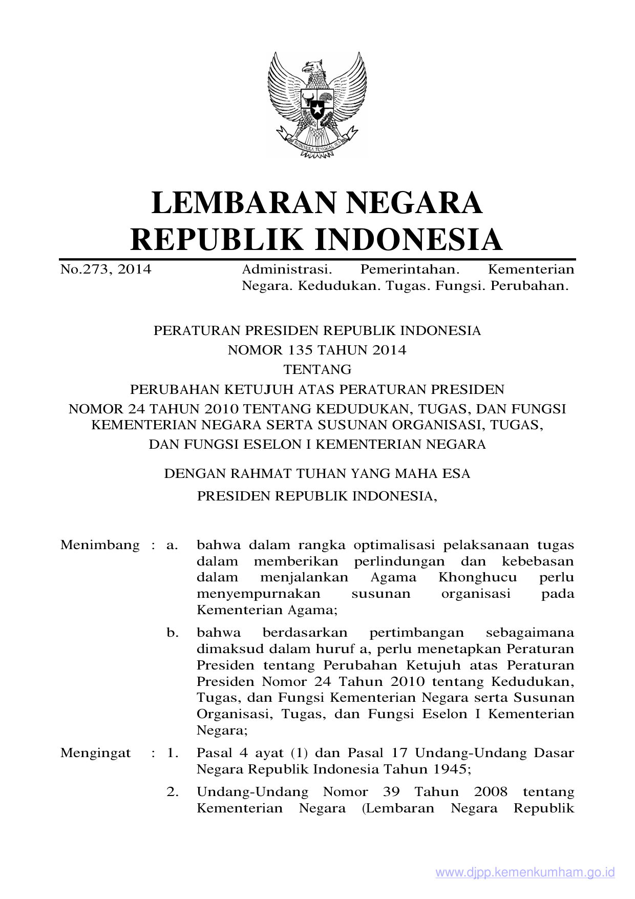 PERPRES Nomor 135 Tahun 2014 | Peraturan Presiden Nomor 135 Tahun 2014 tentang PERUBAHAN KETUJUH ATAS PERATURAN PRESIDENNOMOR 24 TAHUN 2010 TENTANG KEDUDUKAN, TUGAS, DAN FUNGSI KEMENTERIAN NEGARA SERTA SUSUNAN ORGANISASI, TUGAS,DAN FUNGSI ESELON I KEMENTERIAN NEGARA