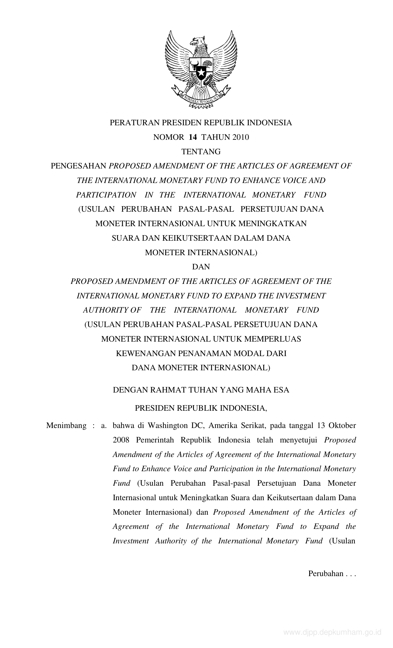 PERPRES Nomor 14 Tahun 2010 | Peraturan Presiden Nomor 14 Tahun 2010 tentang PENGESAHAN PROPOSED AMANDMENT OF THE ARTICLES OF AGREEMENT OF THE INTERNATIONAL MONETARI FUND TO ENHANCE VOICE AND PARTICIPATION IN THE INTERNATIONAL MONETARY FUND (USULAN PERUBAHAN PASAL-PASAL PERSETUJUAN DANA MONETER INTERNASIONAL UNTUK MENINGKATKAN SUARA DAN KEIKUTSERTAAN DALAM DANA MONETER INTERNASIONAL) DAN PROPOSED AMANDMENT OF THE ARTICLES OF AGREEMENT OF THE INVESTMENT AUTHORITY OF THE INTERNATIONAL MONETARY FUND (USULAN PERUBAHAN PASAL-PASAL PERSETUJUAN DANA MONETER INTERNASIONAL UNTUK MEMEPERLUAS KEWENANGAN PENANAMAN MODAL DARI DANA MONETER INTERNASIONAL)