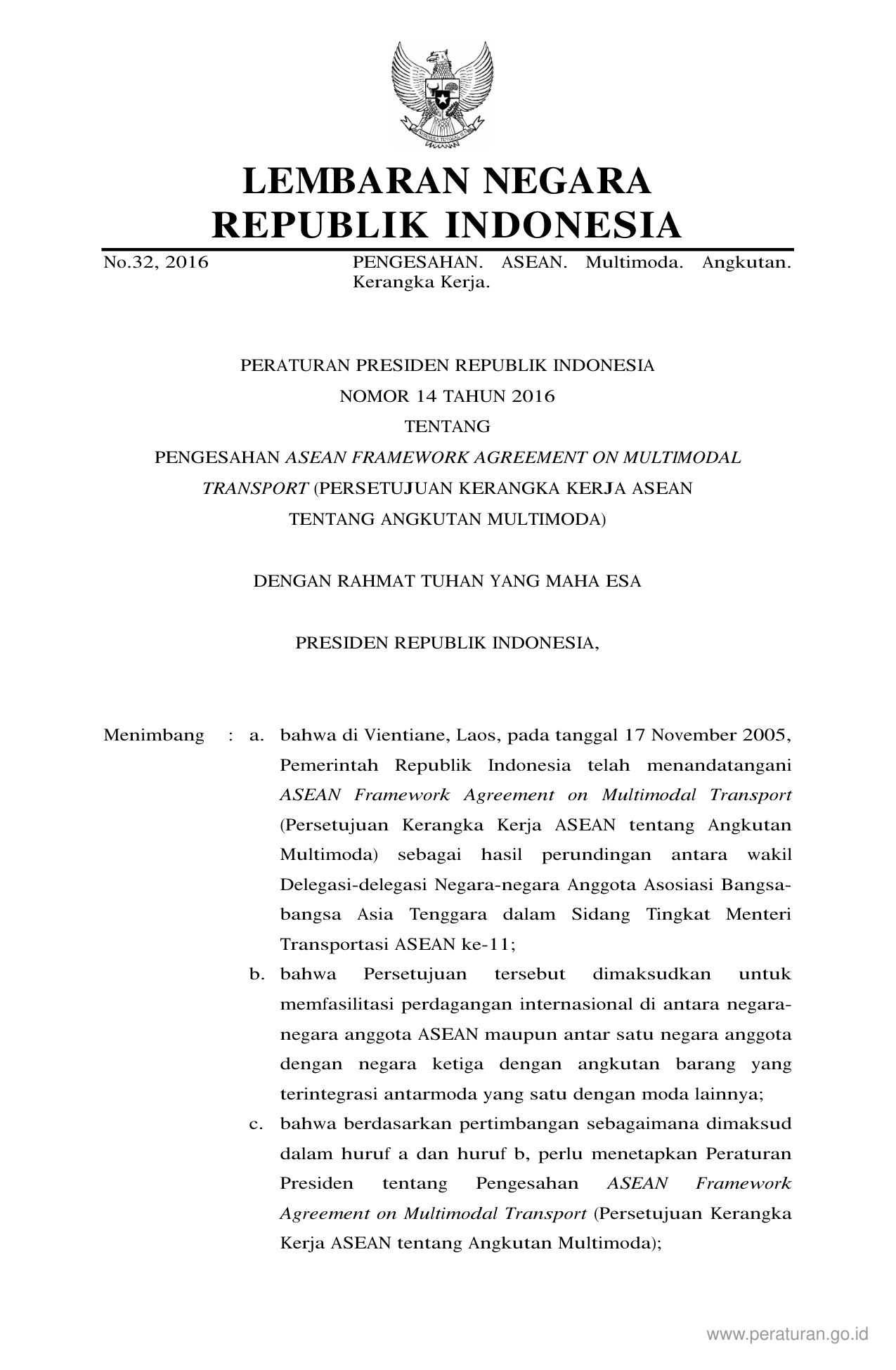 PERPRES Nomor 14 Tahun 2016 | Peraturan Presiden Nomor 14 Tahun 2016 tentang PENGESAHAN ASEAN FRAMEWORK AGREEMENT ON MULTIMODAL TRANSPORT (PERSETUJUAN KERANGKA KERJA ASEAN TENTANG ANGKUTAN MULTIMODA)