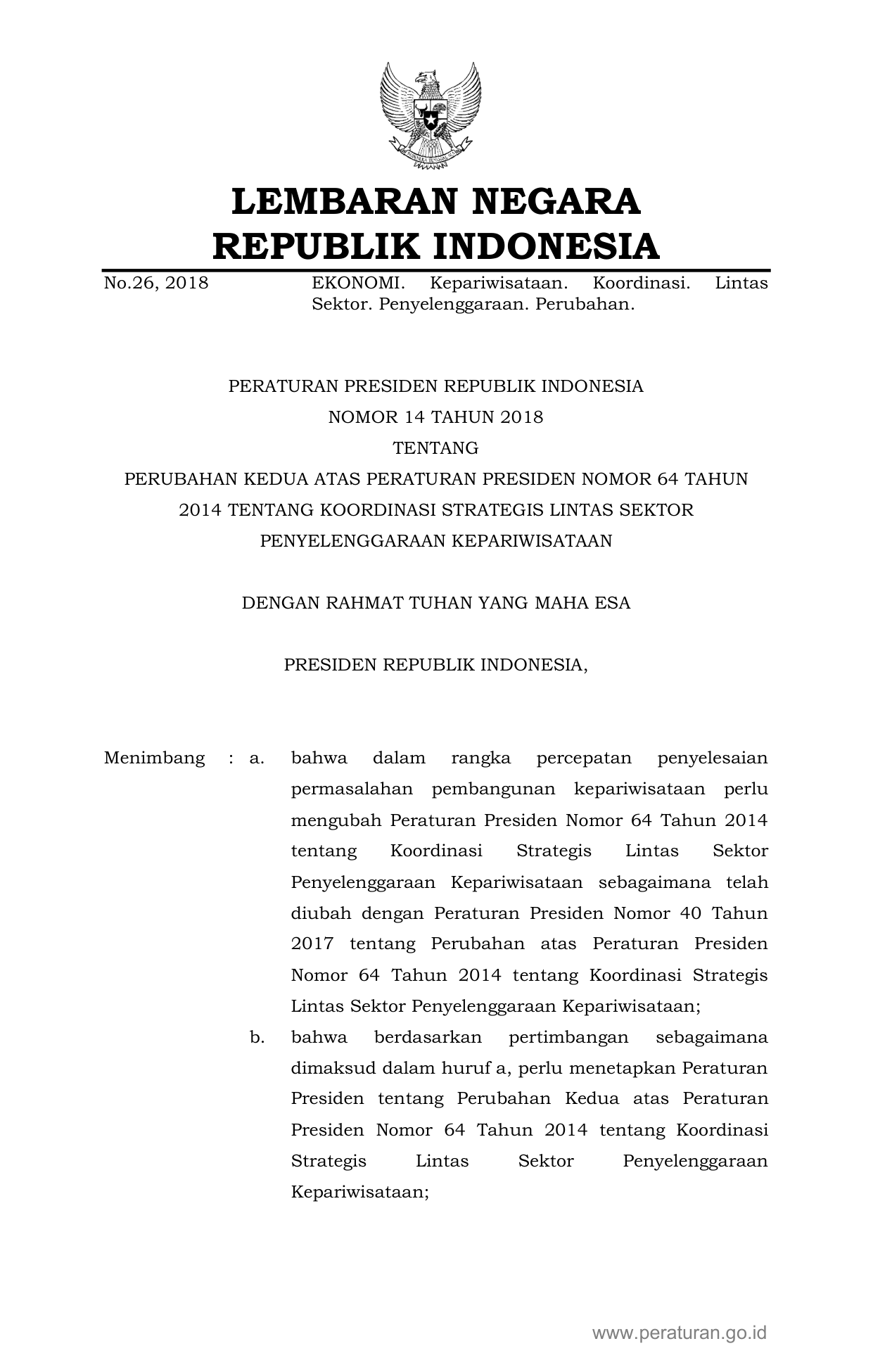 PERPRES Nomor 14 Tahun 2018 | Peraturan Presiden Nomor 14 Tahun 2018 tentang Perubahan Kedua Atas Peraturan Presiden Nomor 64 Tahun 2014 tentang Koordinasi Strategis Lintas Sektor Penyelenggaraan Kepariwisataan