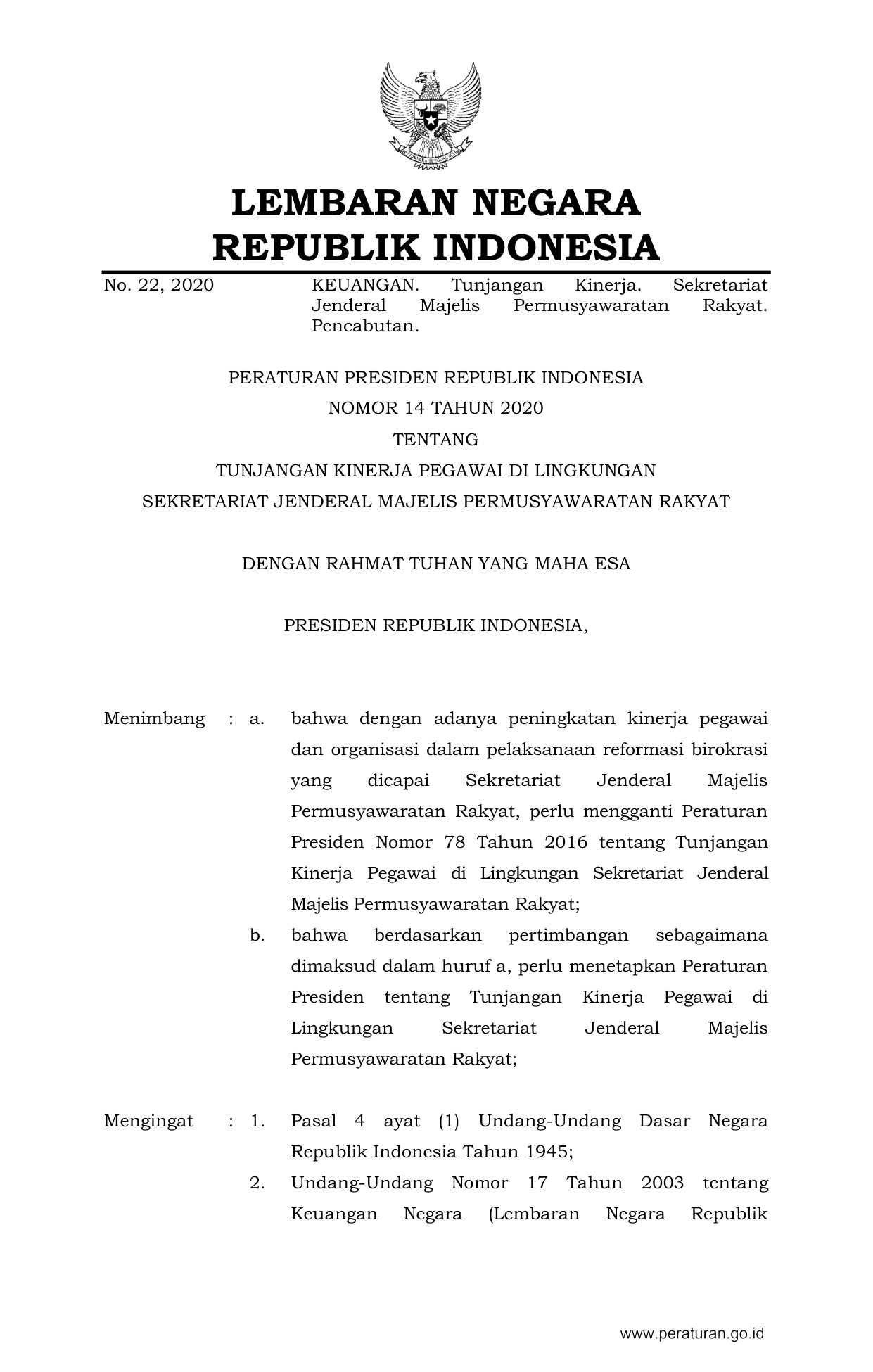 PERPRES Nomor 14 Tahun 2020 | Peraturan Presiden Nomor 14 Tahun 2020 tentang TUNJANGAN KINERJA PEGAWAI DI LINGKUNGAN SEKRETARIAT JENDERAL MAJELIS PERMUSYAWARATAN RAKYAT
