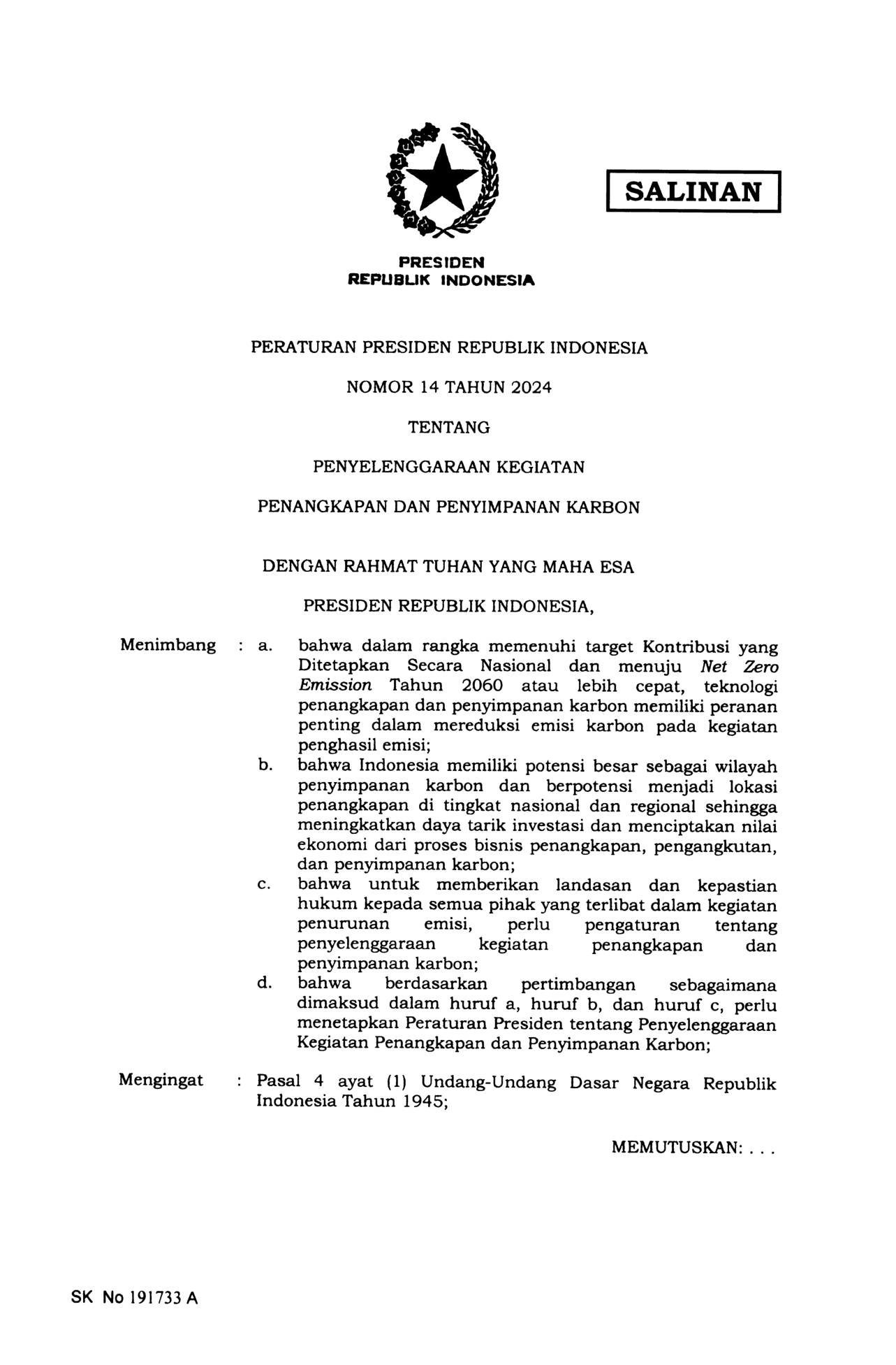 PERPRES Nomor 14 Tahun 2024 | Peraturan Presiden Nomor 14 Tahun 2024 tentang PENYELENGGARAAN KEGIATAN PENANGKAPAN DAN PENYIMPANAN KARBON