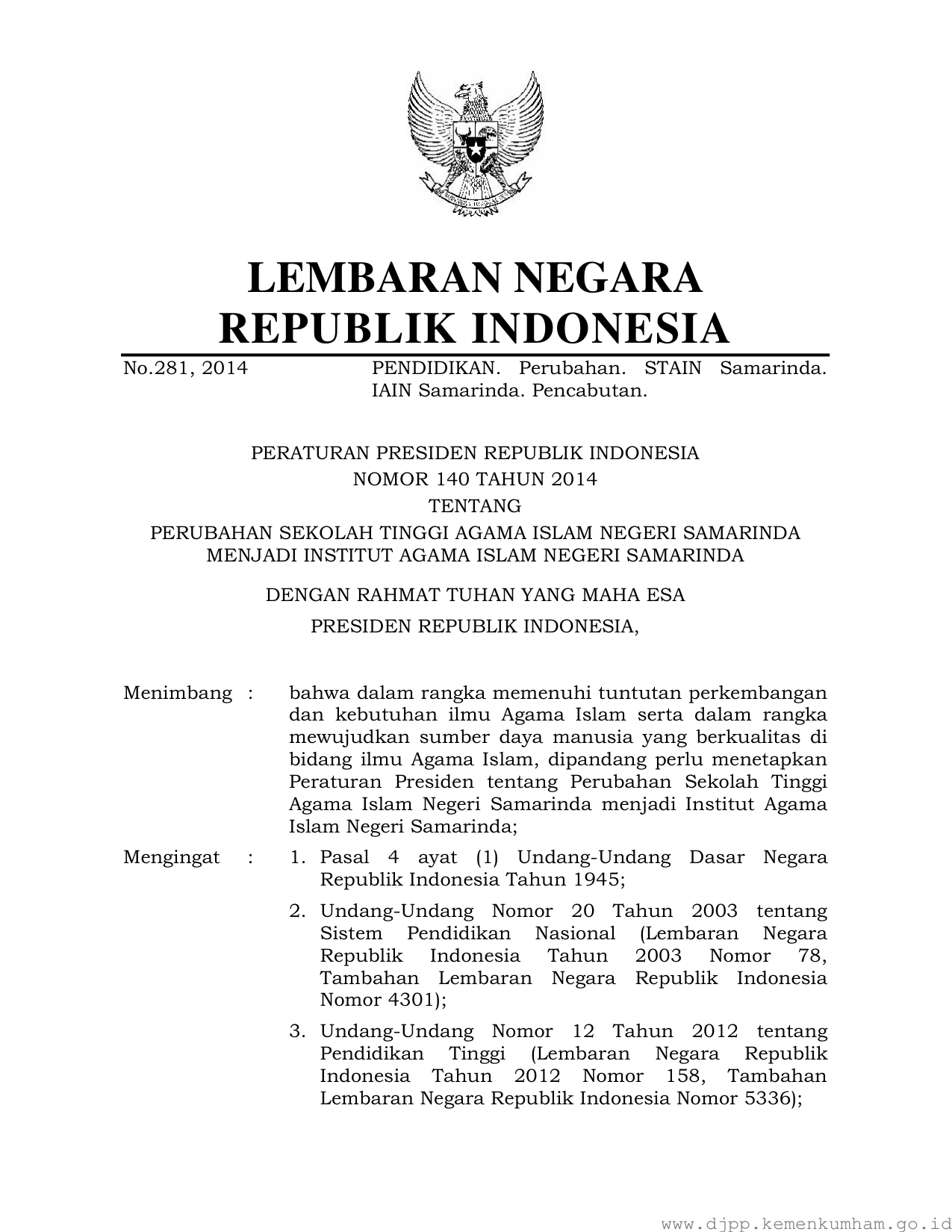 PERPRES Nomor 140 Tahun 2014 | Peraturan Presiden Nomor 140 Tahun 2014 tentang PERUBAHAN SEKOLAH TINGGI AGAMA ISLAM NEGERI SAMARINDA MENJADI INSTITUT AGAMA ISLAM NEGERI SAMARINDA