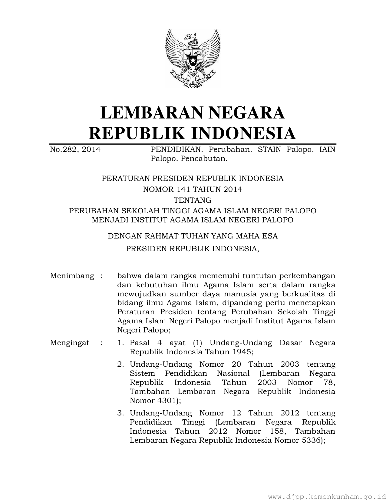 PERPRES Nomor 141 Tahun 2014 | Peraturan Presiden Nomor 141 Tahun 2014 tentang PERUBAHAN SEKOLAH TINGGI AGAMA ISLAM NEGERI PALOPO MENJADI INSTITUT AGAMA ISLAM NEGERI PALOPO