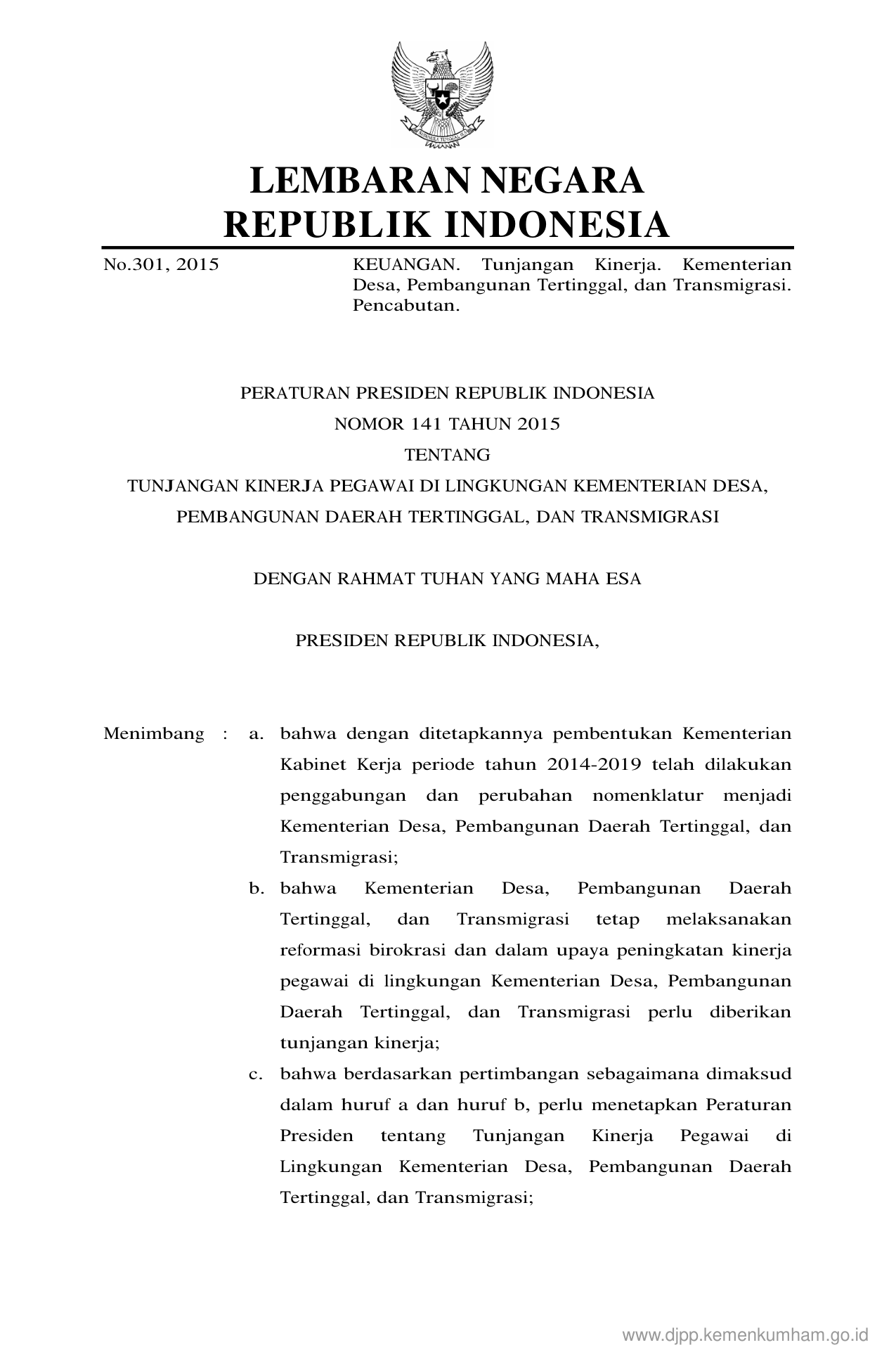 PERPRES Nomor 141 Tahun 2015 | Peraturan Presiden Nomor 141 Tahun 2015 tentang TUNJANGAN KINERJA PEGAWAI DI LINGKUNGAN KEMENTERIAN DESA, PEMBANGUNAN DAERAH TERTINGGAL, DAN TRANSMIGRASI