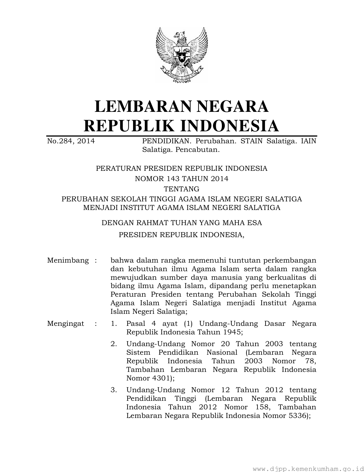 PERPRES Nomor 143 Tahun 2014 | Peraturan Presiden Nomor 143 Tahun 2014 tentang PERUBAHAN SEKOLAH TINGGI AGAMA ISLAM NEGERI SALATIGA MENJADI INSTITUT AGAMA ISLAM NEGERI SALATIGA