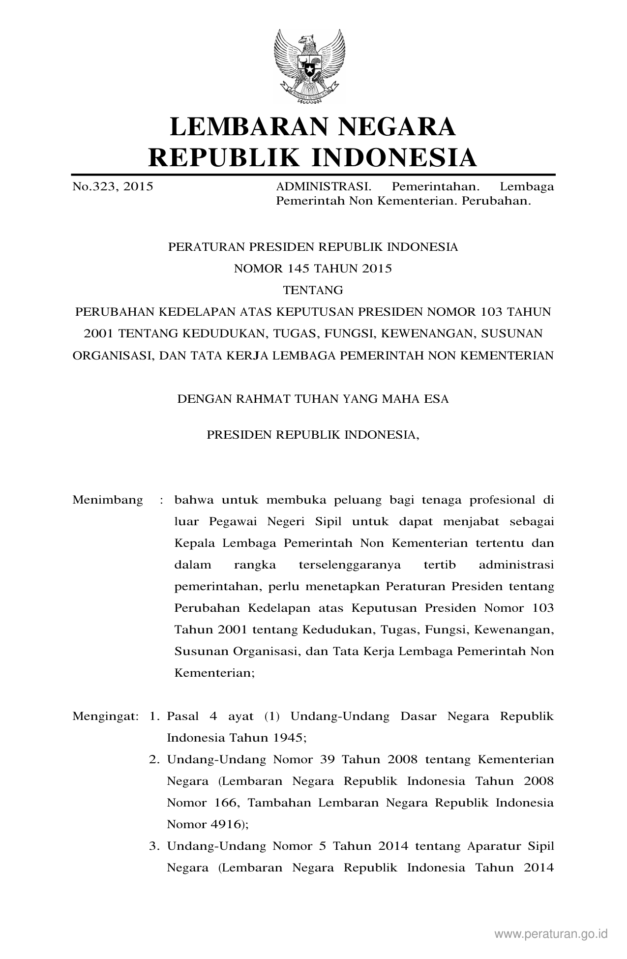 PERPRES Nomor 145 Tahun 2015 | Peraturan Presiden Nomor 145 Tahun 2015 tentang PERUBAHAN KEDELAPAN ATAS KEPUTUSAN PRESIDEN NOMOR 103 TAHUN 2001 TENTANG KEDUDUKAN TUGAS FUNGSI KEWENANGAN SUSUNAN ORGANISASI DAN TATA KERJA LEMBAGA PEMERINTAH NON KEMENTERIAN