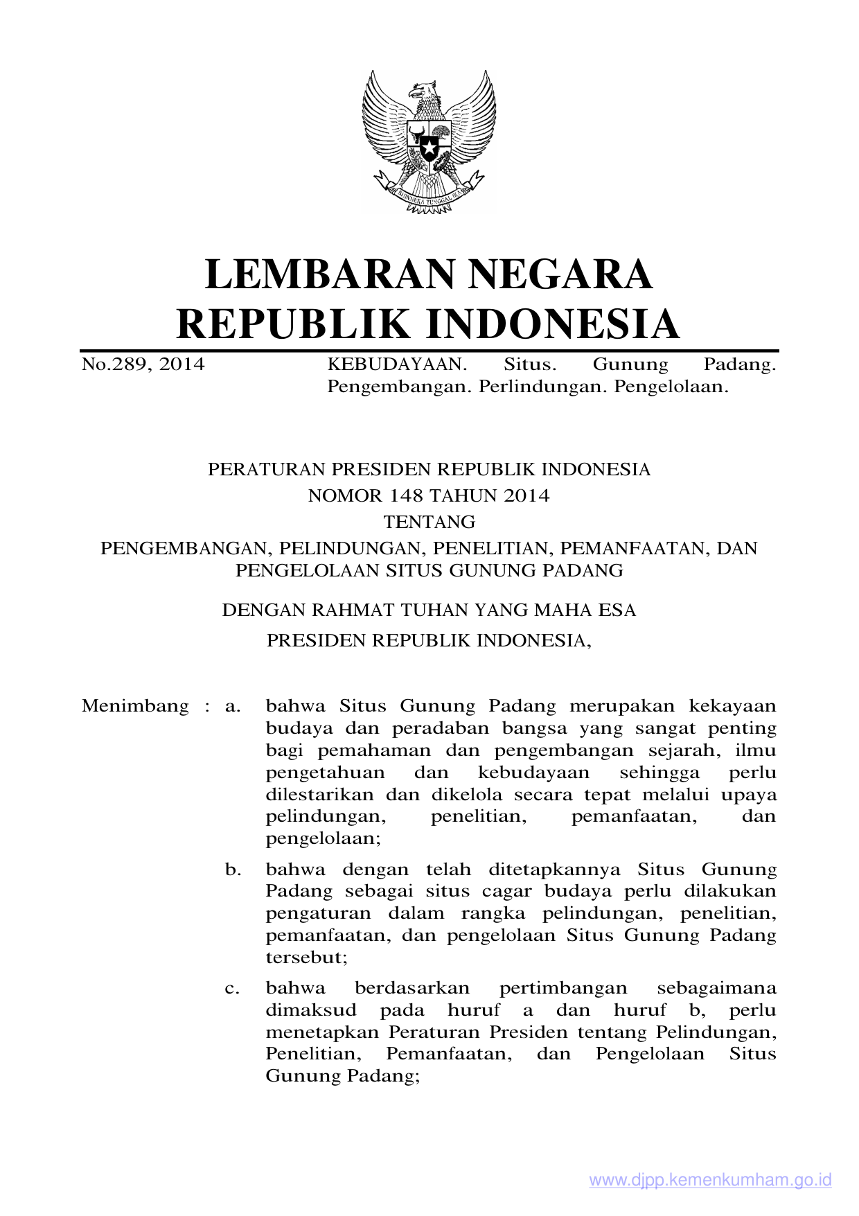PERPRES Nomor 148 Tahun 2014 | Peraturan Presiden Nomor 148 Tahun 2014 tentang PENGEMBANGAN, PELINDUNGAN, PENELITIAN, PEMANFAATAN, DAN PENGELOLAAN SITUS GUNUNG PADANG