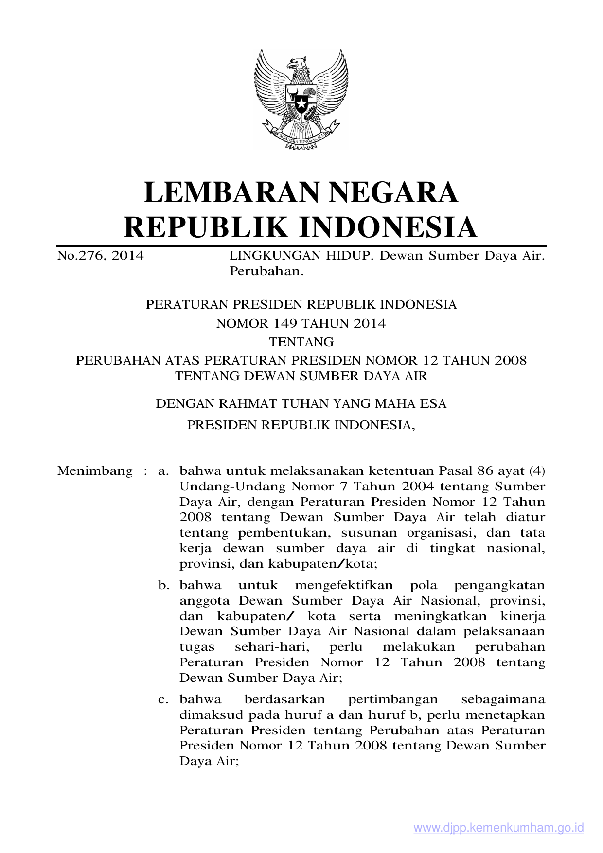 PERPRES Nomor 149 Tahun 2014 | Peraturan Presiden Nomor 149 Tahun 2014 tentang PERUBAHAN ATAS PERATURAN PRESIDEN NOMOR 12 TAHUN 2008 TENTANG DEWAN SUMBER DAYA AIR