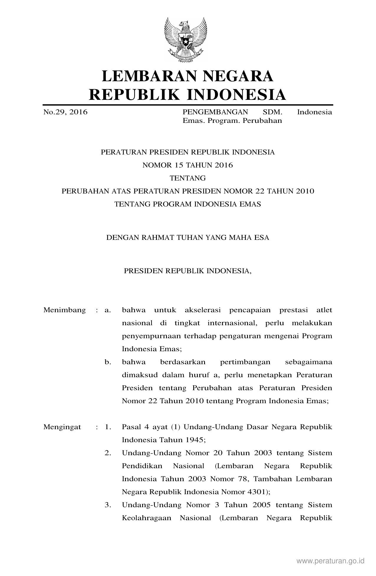 PERPRES Nomor 15 Tahun 2016 | Peraturan Presiden Nomor 15 Tahun 2016 tentang PERUBAHAN ATAS PERATURAN PRESIDEN NOMOR 22 TAHUN 2010 TENTANG PROGRAM INDONESIA EMAS