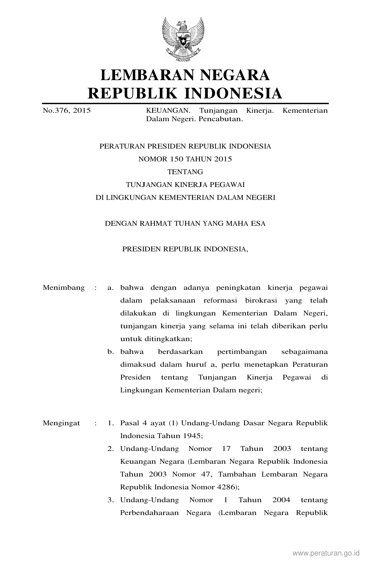 PERPRES Nomor 150 Tahun 2015 | Peraturan Presiden Nomor 150 Tahun 2015 tentang TUNJANGAN KINERJA PEGAWAI DI LINGKUNGAN KEMENTERIAN DALAM NEGERI
