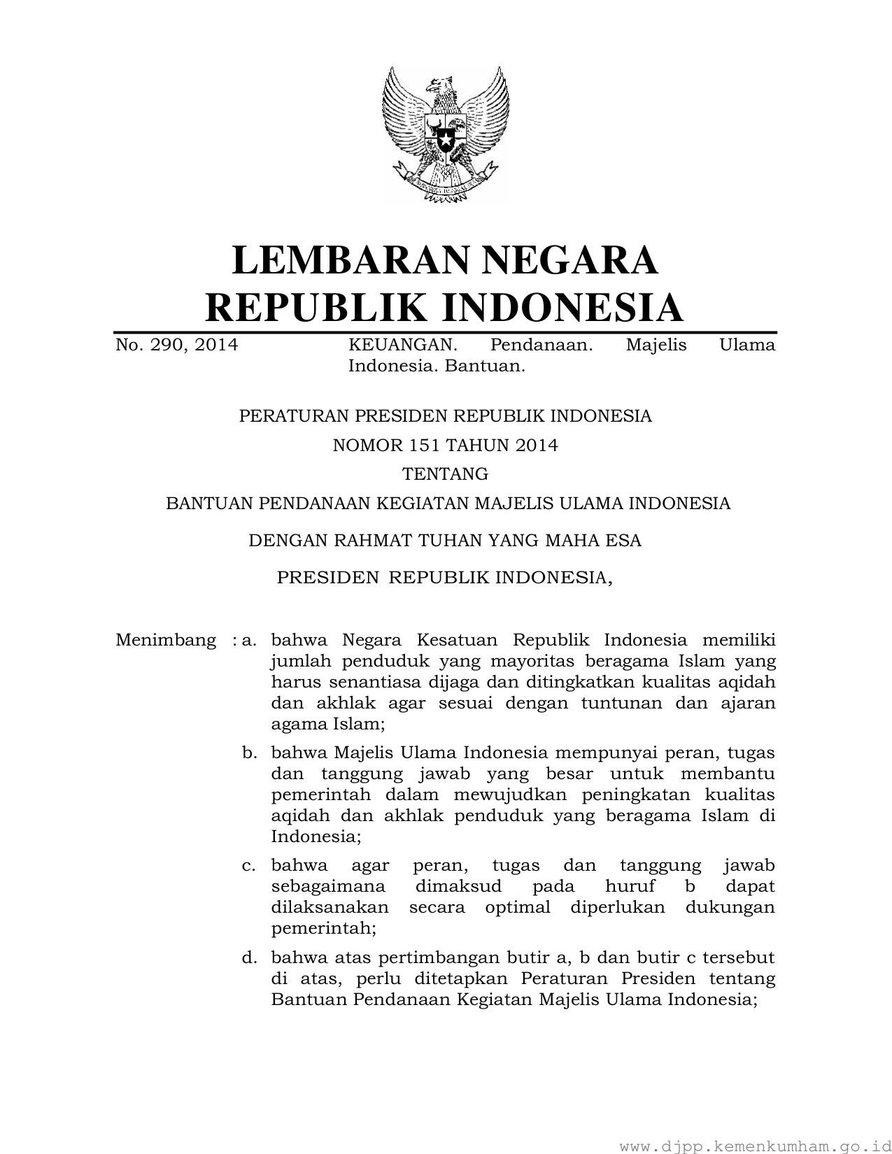 PERPRES Nomor 151 Tahun 2014 | Peraturan Presiden Nomor 151 Tahun 2014 tentang BANTUAN PENDANAAN KEGIATAN MAJELIS ULAMA INDONESIA