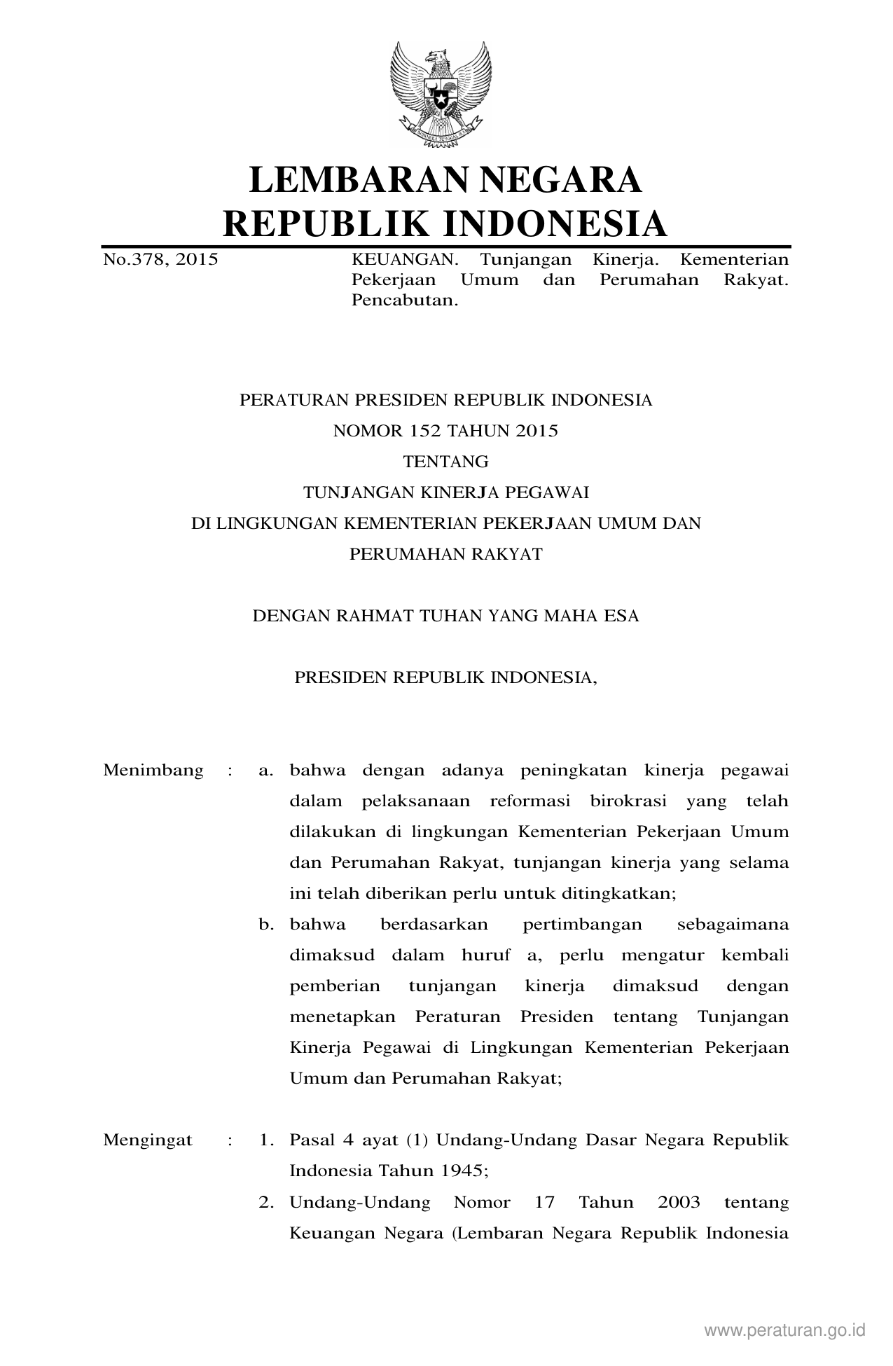 PERPRES Nomor 152 Tahun 2015 | Peraturan Presiden Nomor 152 Tahun 2015 tentang TUNJANGAN KINERJA PEGAWAI DI LINGKUNGAN KEMENTERIAN PEKERJAAN UMUM DAN PERUMAHAN RAKYAT