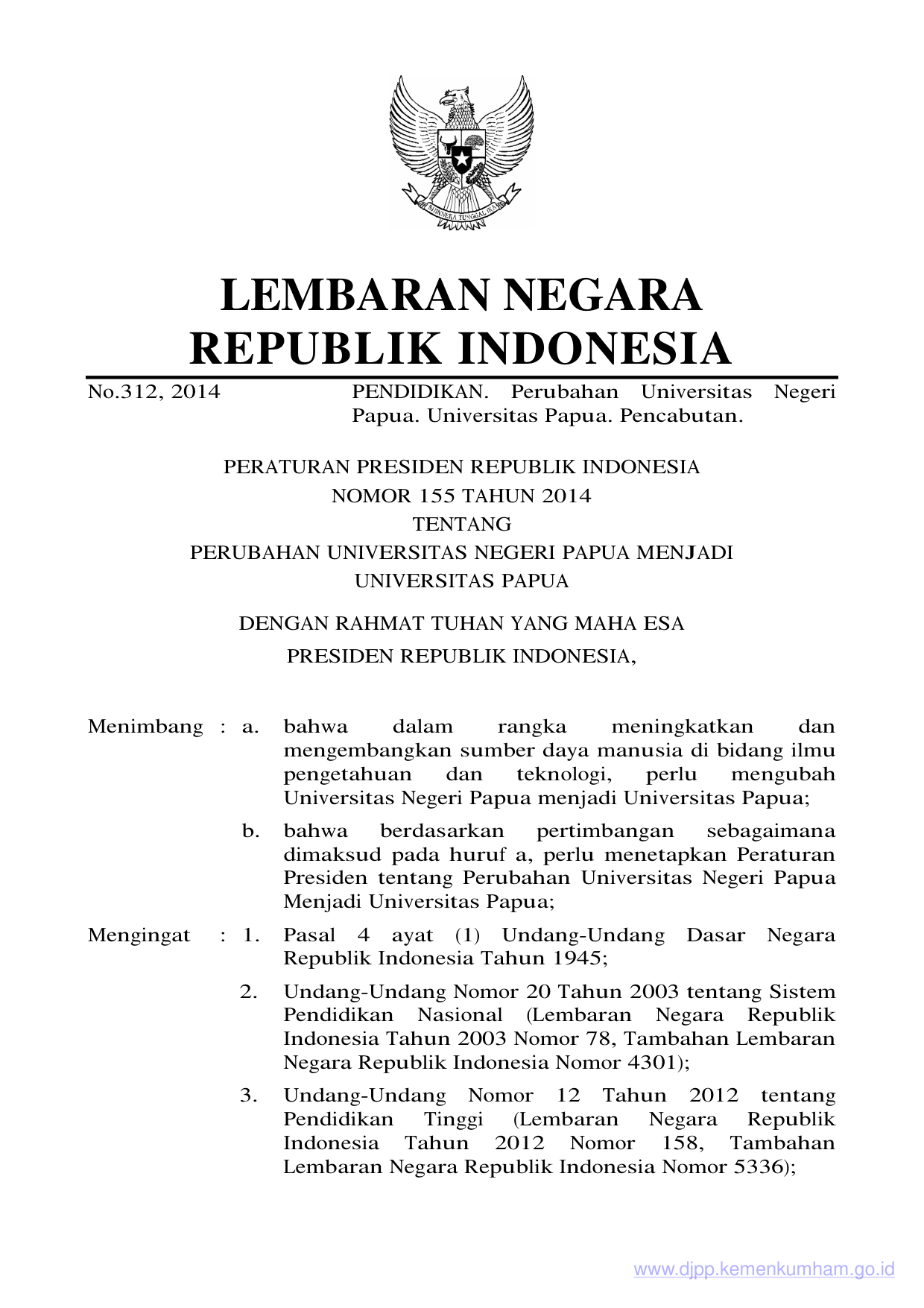 PERPRES Nomor 155 Tahun 2014 | Peraturan Presiden Nomor 155 Tahun 2014 tentang PERUBAHAN UNIVERSITAS NEGERI PAPUA MENJADIUNIVERSITAS PAPUA