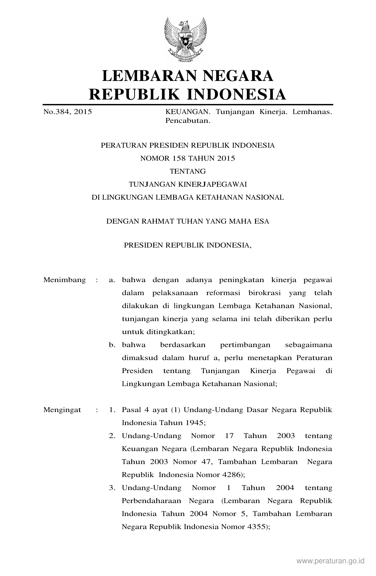PERPRES Nomor 158 Tahun 2015 | Peraturan Presiden Nomor 158 Tahun 2015 tentang TUNJANGAN KINERJA PEGAWAI DI LINGKUNGAN LEMBAGA KETAHANAN NASIONAL