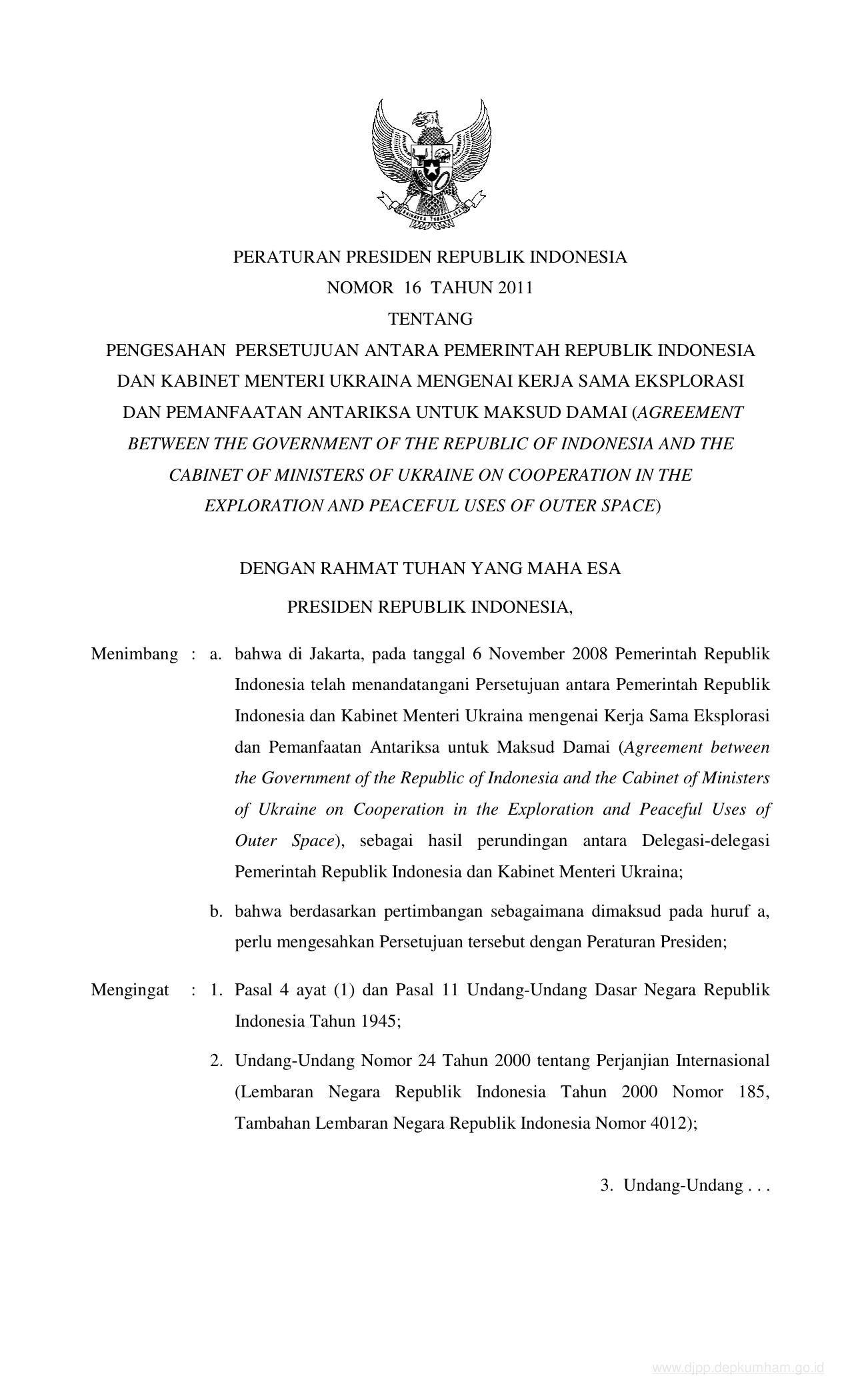 PERPRES Nomor 16 Tahun 2011 | Peraturan Presiden Nomor 16 Tahun 2011 tentang PENGESAHAN PERSETUJUAN ANTARA PEMERINTAH REPUBLIK INDONESIA DAN KABINET MENTERI UKRAINA MENGENAI KERJA SAMA EKSPLORASI DAN PEMANFAATAN ANTARIKSA UNTUK MAKSUD DAMAI (AGREEMENT BETWEEN THE GOVERNMENT OF THE REPUBLIC OF INDONESIA AND THE CABINET OF MINISTERS OF UKRAINE ON COOPERATION IN THE EXPLORATION AND PEACEFUL USES OF OUTER SPACE)