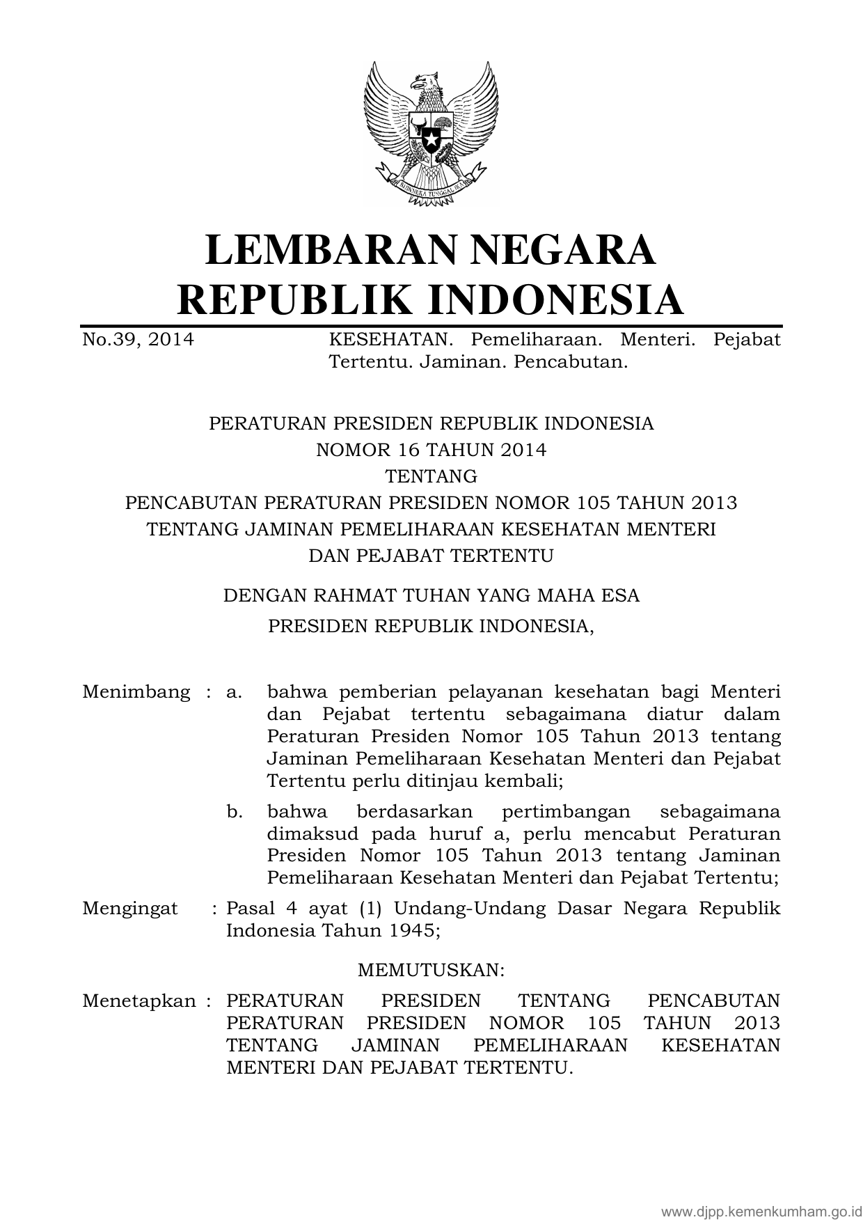 PERPRES Nomor 16 Tahun 2014 | Peraturan Presiden Nomor 16 Tahun 2014 tentang PENCABUTAN PERATURAN PRESIDEN NOMOR 105 TAHUN 2013 TENTANG JAMINAN PEMELIHARAAN KESEHATAN MENTERI DAN PEJABAT TERTENTU
