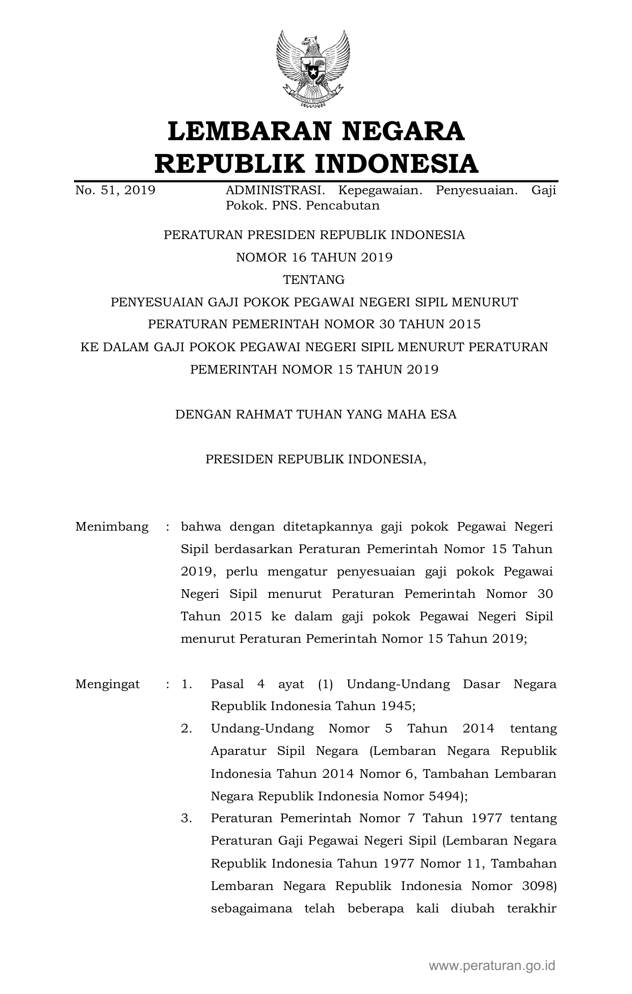 PERPRES Nomor 16 Tahun 2019 | Peraturan Presiden Nomor 16 Tahun 2019 tentang PENYESUAIAN GAJI POKOK PEGAWAI NEGERI SIPIL MENURUT PERATURAN PEMERINTAH NOMOR 30 TAHUN 2015 KE DALAM GAJI POKOK PEGAWAI NEGERI SIPIL MENURUT PERATURAN PEMERINTAH NOMOR 15 TAHUN 2019