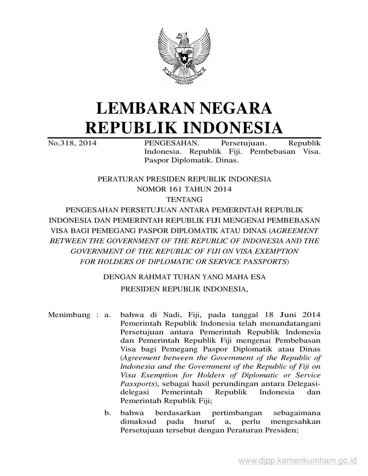 PERPRES Nomor 161 Tahun 2014 | Peraturan Presiden Nomor 161 Tahun 2014 tentang PENGESAHAN PERSETUJUAN ANTARA PEMERINTAH REPUBLIKINDONESIA DAN PEMERINTAH REPUBLIK FIJI MENGENAI PEMBEBASANVISA BAGI PEMEGANG PASPOR DIPLOMATIK ATAU DINAS (AGREEMENTBETWEEN THE GOVERNMENT OF THE REPUBLIC OF INDONESIA AND THEGOVERNMENT OF THE REPUBLIC OF FIJI ON VISA EXEMPTIONFOR HOLDERS OF DIPLOMATIC OR SERVICE PASSPORTS)