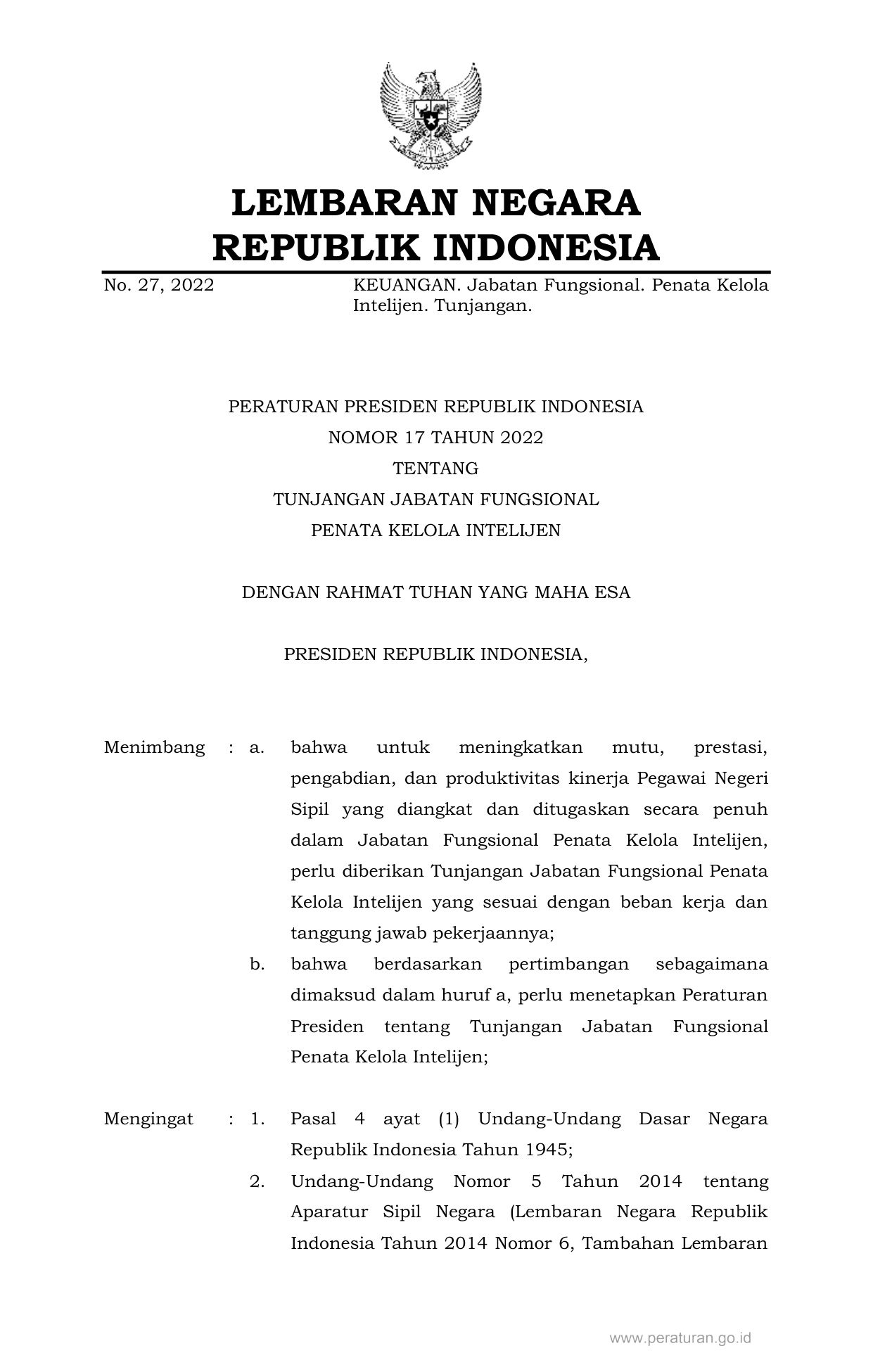 PERPRES Nomor 17 Tahun 2022 | Peraturan Presiden Nomor 17 Tahun 2022 tentang TUNJANGAN JABATAN FUNGSIONAL PENATA KELOLA INTELIJEN