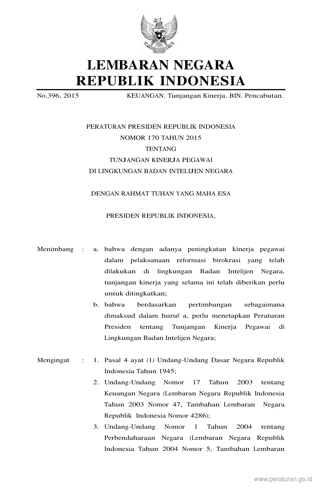PERPRES Nomor 170 Tahun 2015 | Peraturan Presiden Nomor 170 Tahun 2015 tentang TUNJANGAN KINERJA PEGAWAI DI LINGKUNGAN BADAN INTELIJEN NEGARA