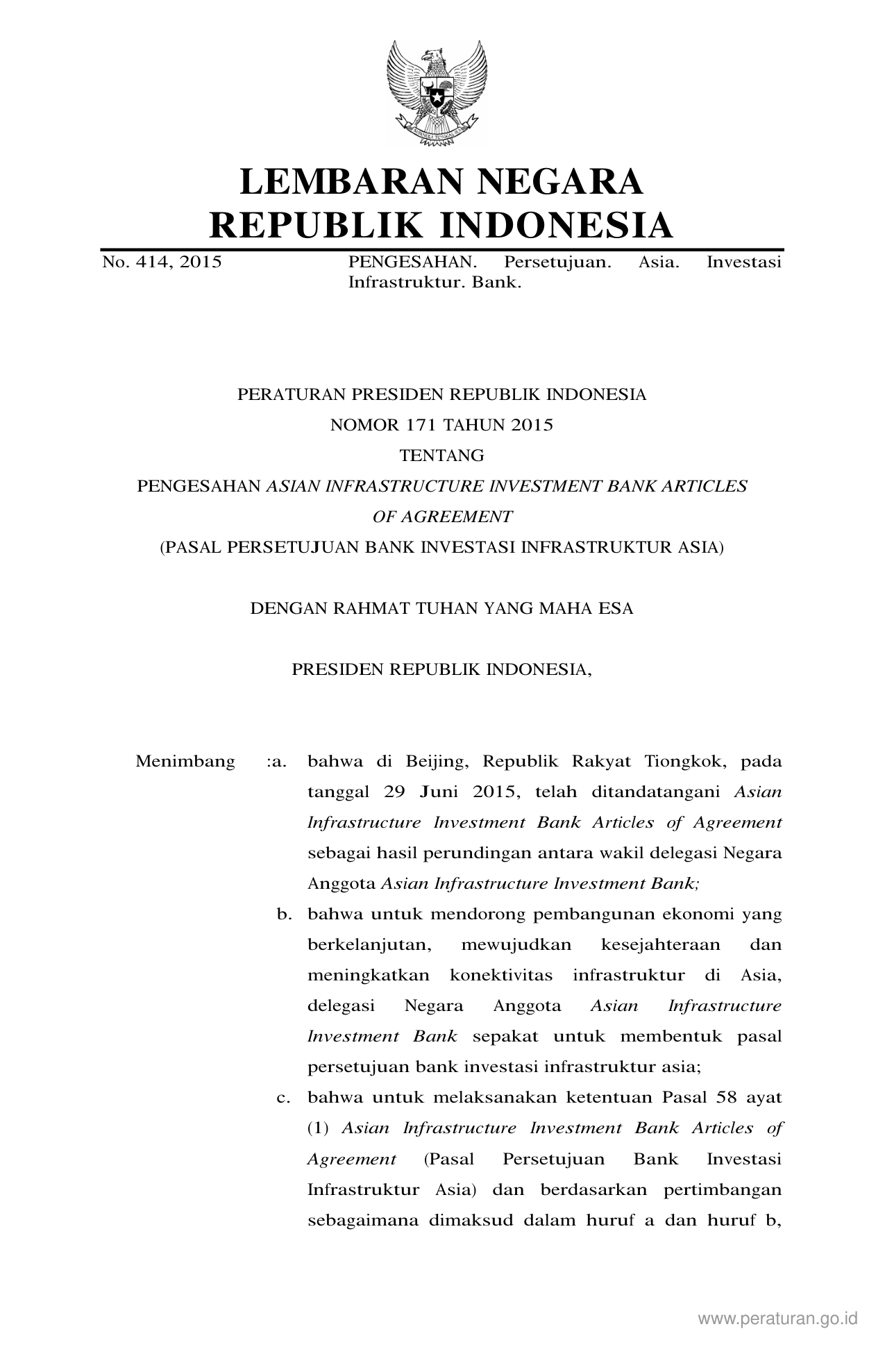 PERPRES Nomor 171 Tahun 2015 | Peraturan Presiden Nomor 171 Tahun 2015 tentang PENGESAHAN ASIAN INFRASTRUCTURE INVESTMENT BANK ARTICLES OF AGREEMENT