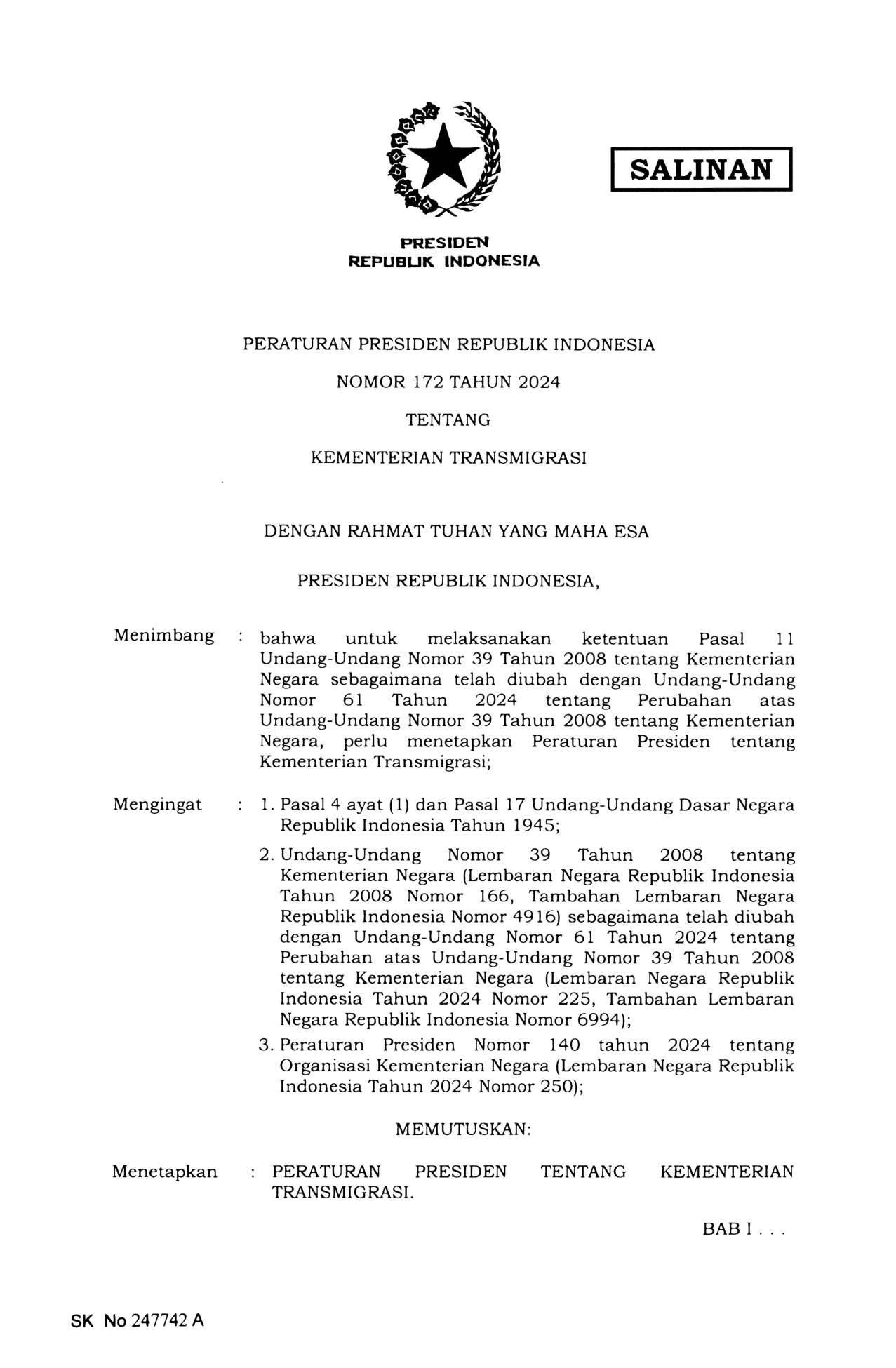 PERPRES Nomor 172 Tahun 2024 | Peraturan Presiden Nomor 172 Tahun 2024 tentang KEMENTERIAN TRANSMIGRASI