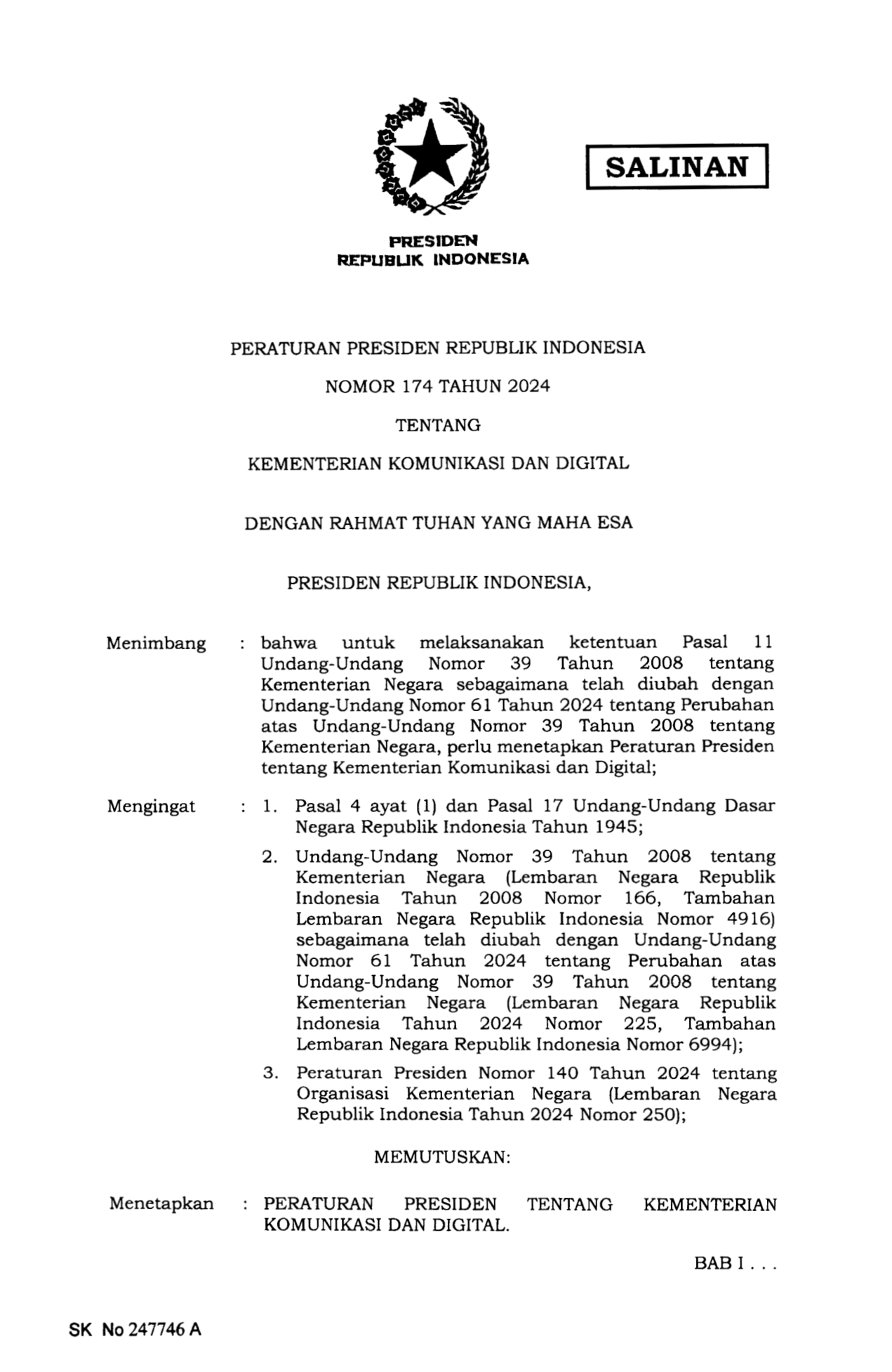 PERPRES Nomor 174 Tahun 2024 | Peraturan Presiden Nomor 174 Tahun 2024 tentang KEMENTERIAN KOMUNIKASI DAN DIGITAL