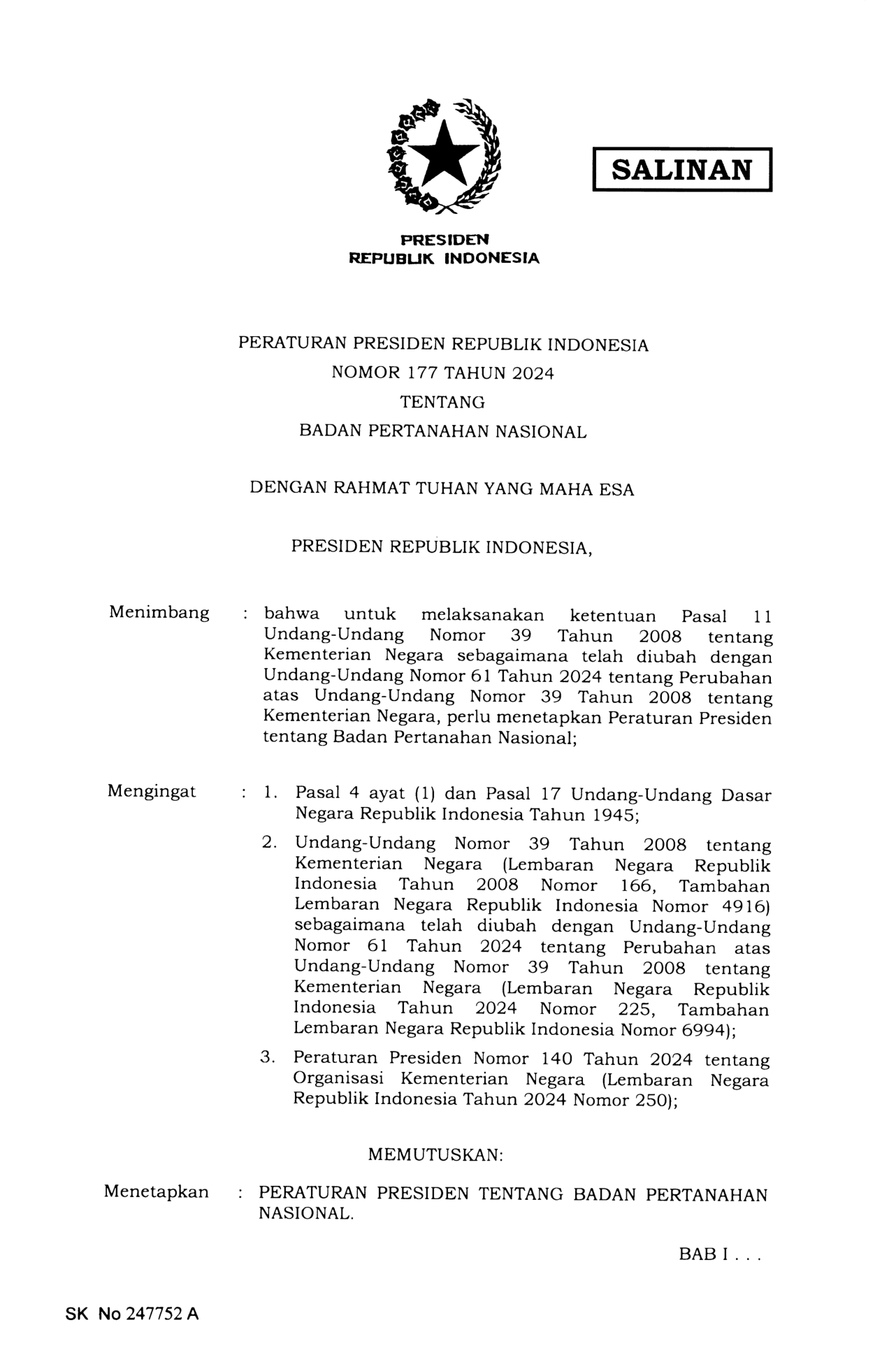 PERPRES Nomor 177 Tahun 2024 | Peraturan Presiden Nomor 177 Tahun 2024 tentang BADAN PERTANAHAN NASIONAL