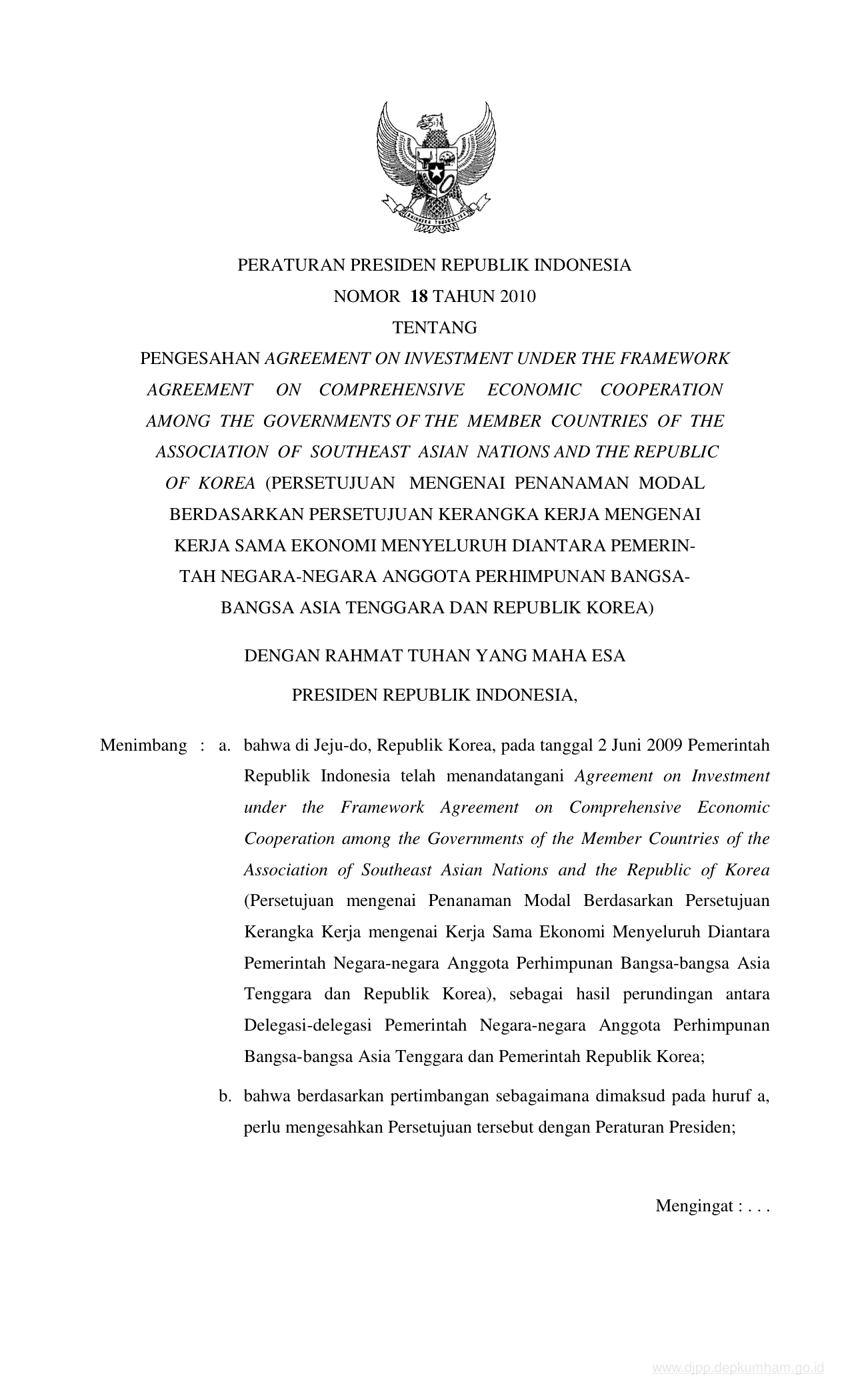 PERPRES Nomor 18 Tahun 2010 | Peraturan Presiden Nomor 18 Tahun 2010 tentang PENGESAHAN AGREEMENT ON INVESTMENT UNDER THE FRAMEWORK AGREEMENT ON COMPREHENSIVE ECONOMIC COOPERATION AMONG THE GOVERNMENTS OF THE MEMBER COUNTRIES OF THE ASSOCIATION OF SOUTH EAST ASIAN NATIONS AND THE REPUBLIC OF KOREA (PERSETUJUAN MENGENAI PENANAMAN MODAL BERDASARKAN PERSETUJUAN KERANGKA KERJA MENGENAI KERJA SAMA EKONOMI MENYELURUH DIANTARA PEMERINTAH NEGARA-NEGARA ANGGOTA PERHIMPUNAN BANGSA-BANGSA ASIA TENGGARA DAN REPUBLIK KOREA)