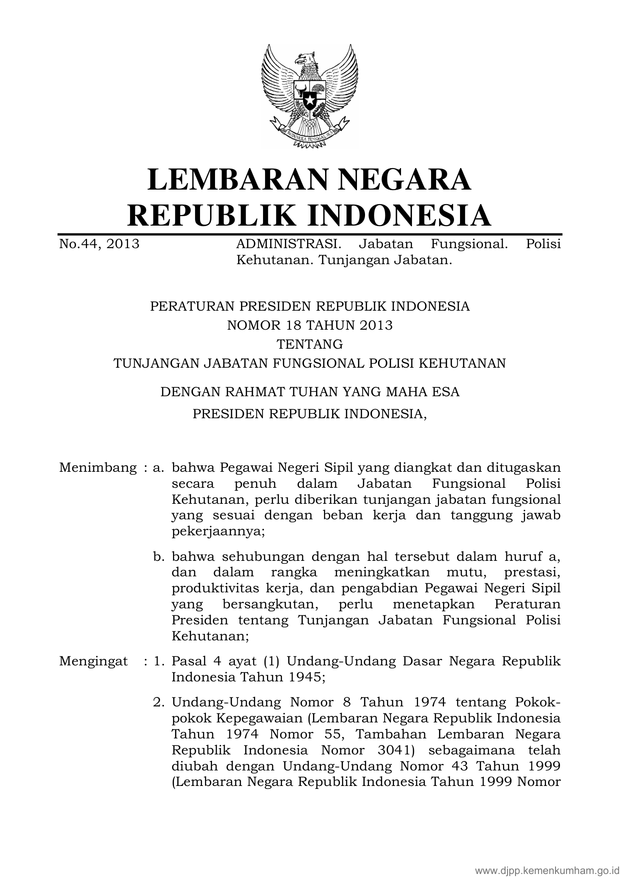PERPRES Nomor 18 Tahun 2013 | Peraturan Presiden Nomor 18 Tahun 2013 tentang TUNJANGAN JABATAN FUNGSIONAL POLISI KEHUTANAN