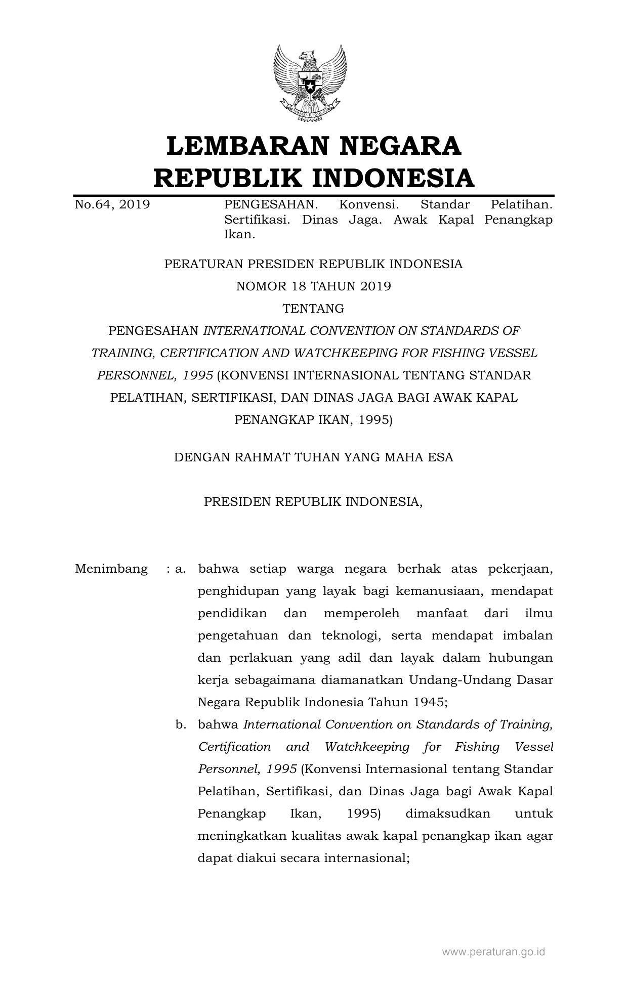 PERPRES Nomor 18 Tahun 2019 | Peraturan Presiden Nomor 18 Tahun 2019 tentang PENGESAHAN INTERNATIONAL CONVENTION ON STANDARDS OF TRAINING, CERTIFICATION AND WATCHKEEPING FOR FISHING VESSEL PERSONNEL, 1995 (KONVENSI INTERNASIONAL TENTANG STANDAR PELATIHAN, SERTIFIKASI, DAN DINAS JAGA BAGI AWAK KAPAL PENANGKAP IKAN, 1995)