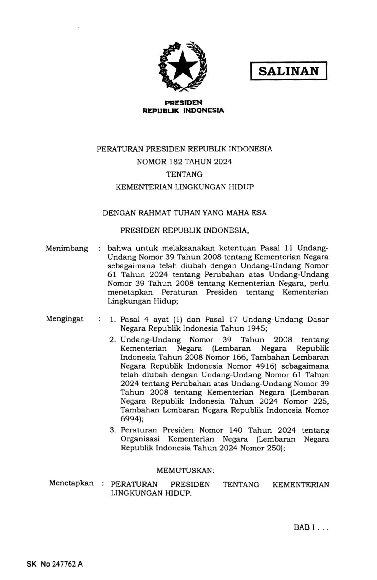 PERPRES Nomor 182 Tahun 2024 | Peraturan Presiden Nomor 182 Tahun 2024 tentang KEMENTERIAN LINGKUNGAN HIDUP