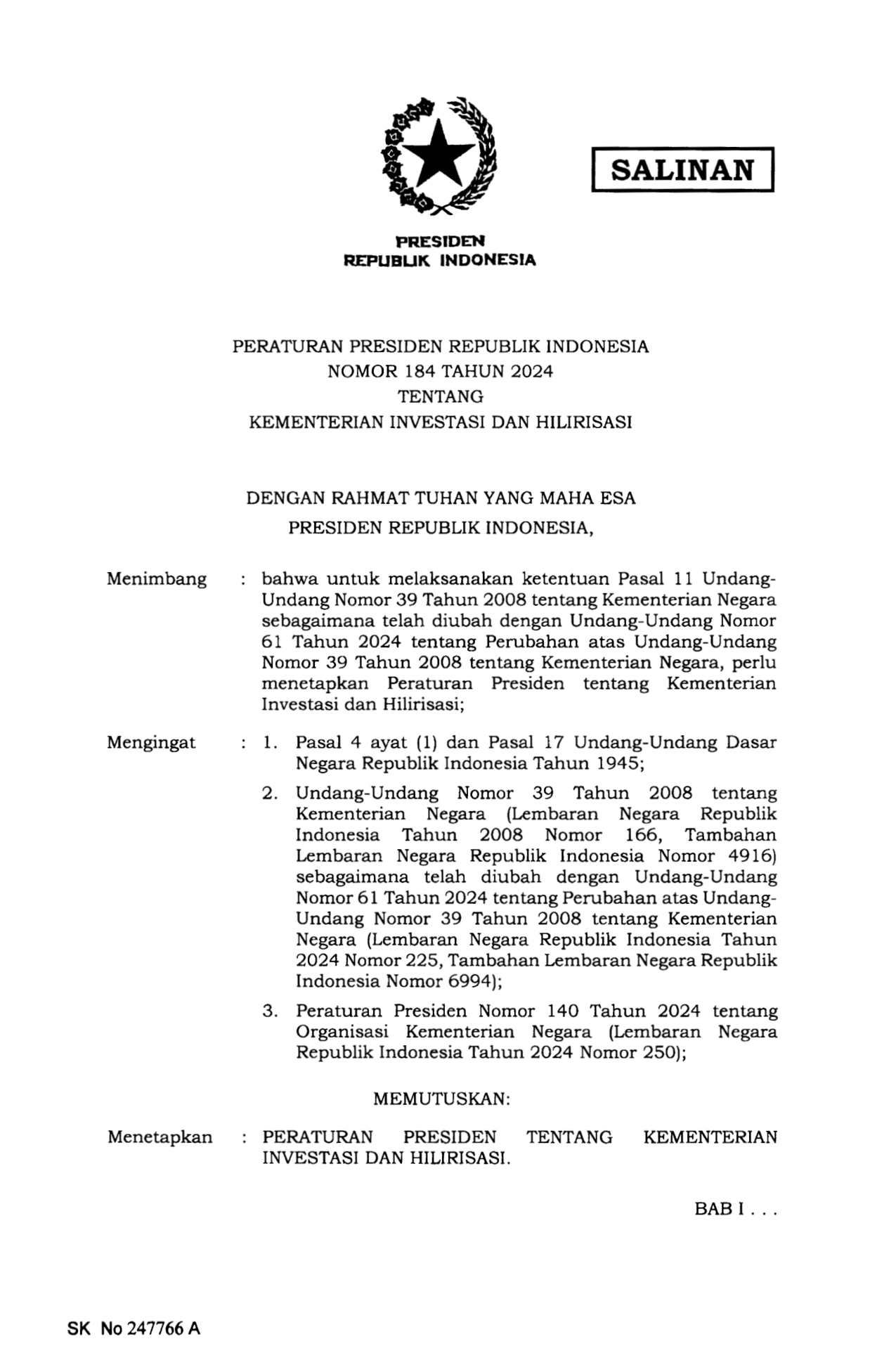 PERPRES Nomor 184 Tahun 2024 | Peraturan Presiden Nomor 184 Tahun 2024 tentang KEMENTERIAN INVESTASI DAN HILIRISASI