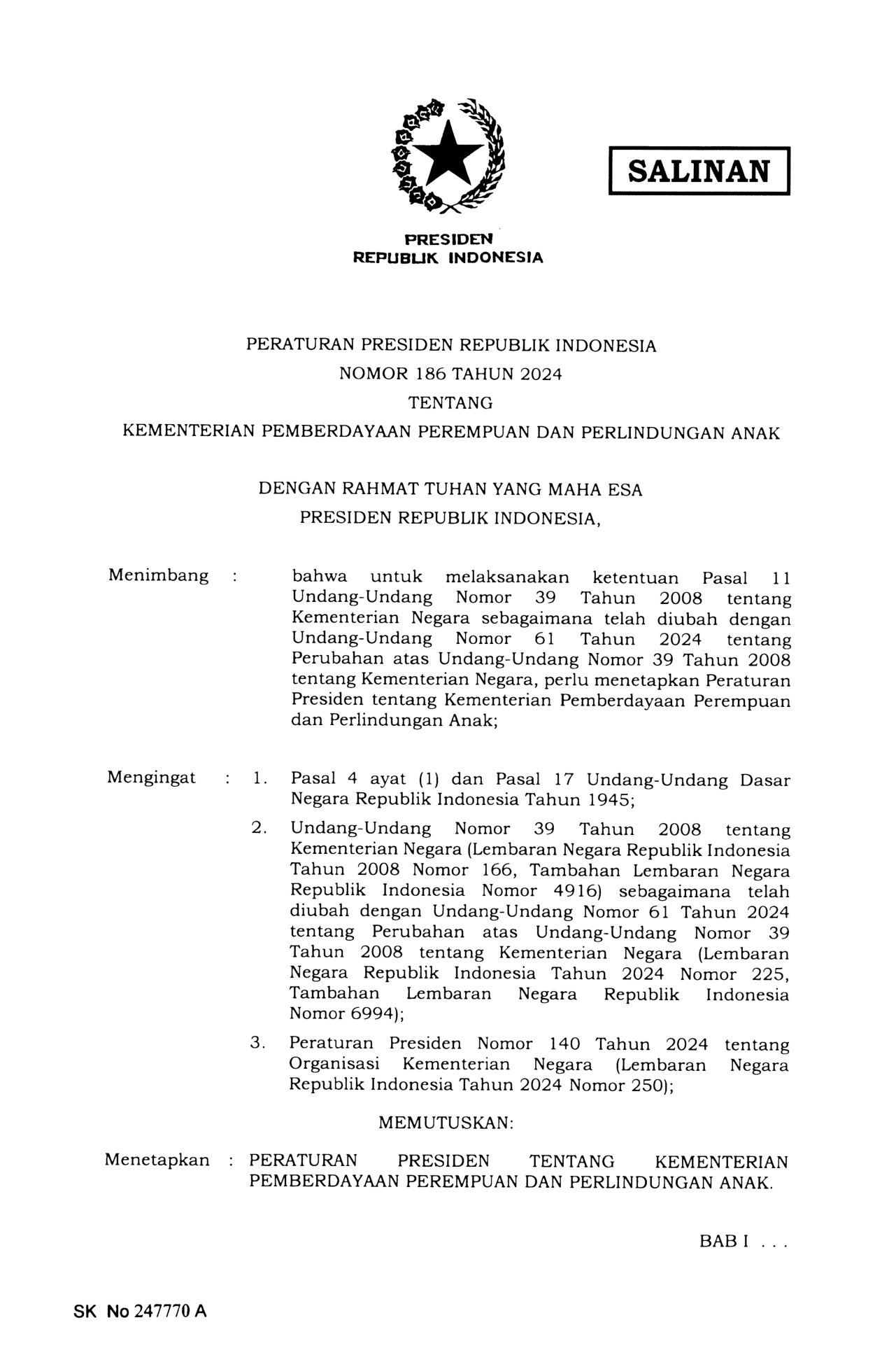 PERPRES Nomor 186 Tahun 2024 | Peraturan Presiden Nomor 186 Tahun 2024 tentang KEMENTERIAN PEMBERDAYAAN PEREMPUAN DAN PERLINDUNGAN ANAK