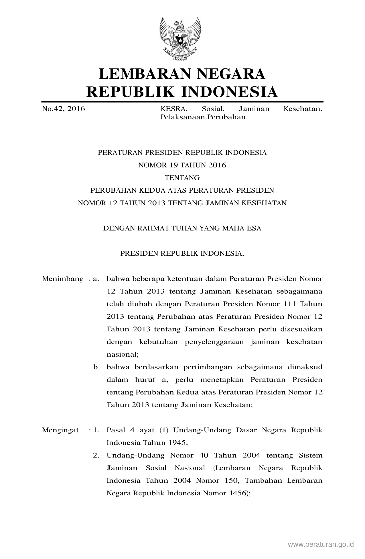 PERPRES Nomor 19 Tahun 2016 | Peraturan Presiden Nomor 19 Tahun 2016 tentang PERUBAHAN KEDUA ATAS PERATURAN PRESIDEN NOMOR 12 TAHUN 2013 TENTANG JAMINAN KESEHATAN
