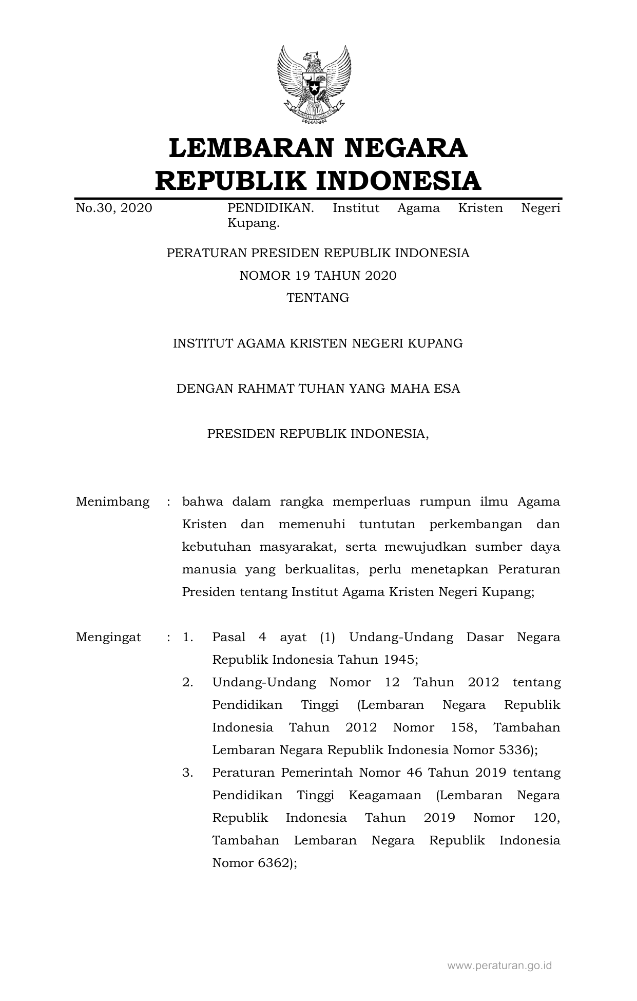PERPRES Nomor 19 Tahun 2020 | Peraturan Presiden Nomor 19 Tahun 2020 tentang INSTITUT AGAMA KRISTEN NEGERI KUPANG