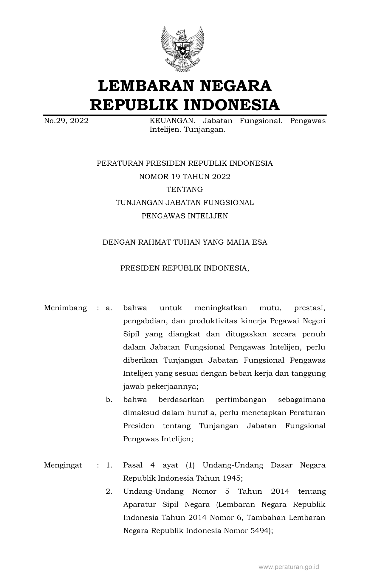 PERPRES Nomor 19 Tahun 2022 | Peraturan Presiden Nomor 19 Tahun 2022 tentang TUNJANGAN JABATAN FUNGSIONAL PENGAWAS INTELIJEN