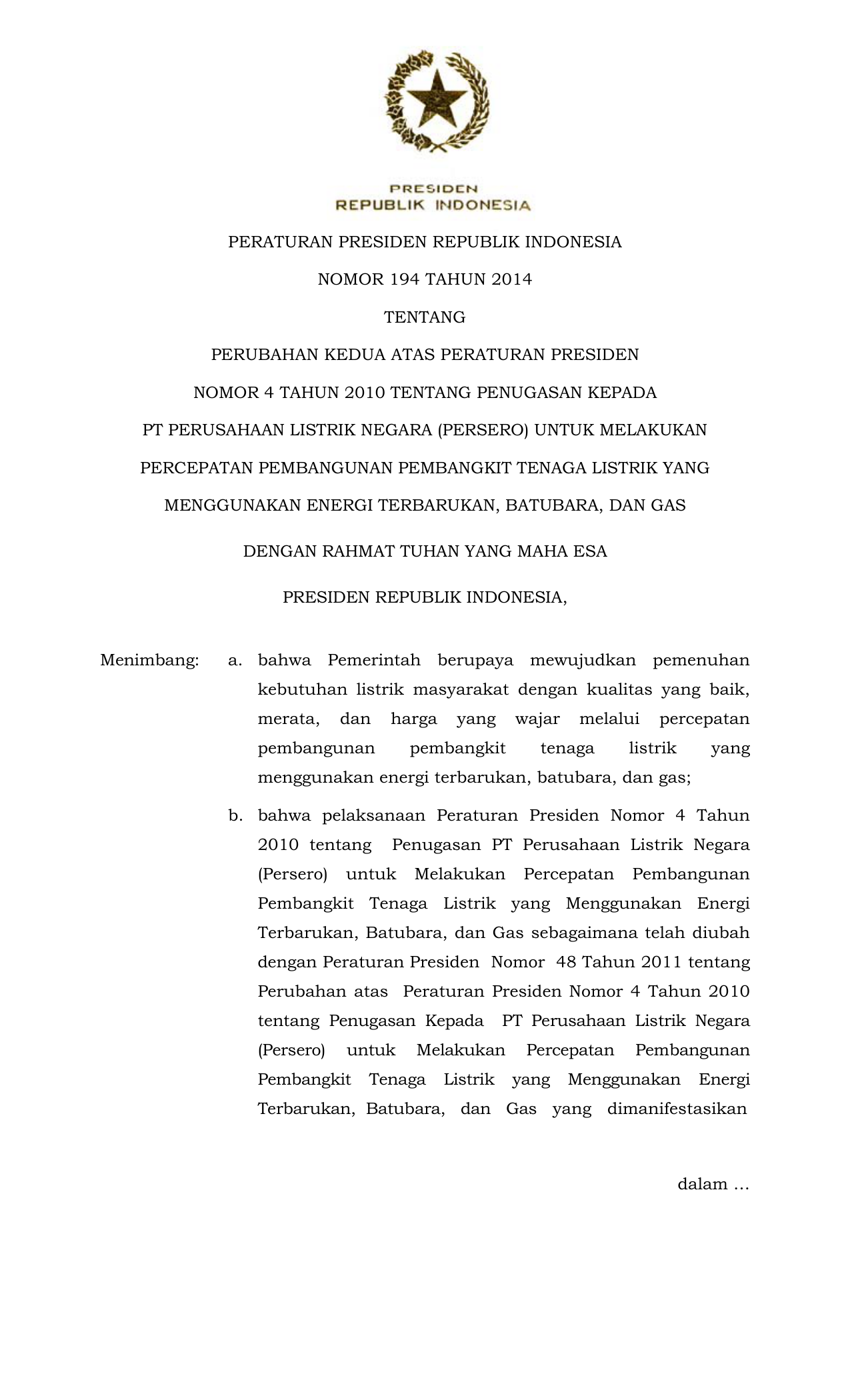 PERPRES Nomor 194 Tahun 2014 | Peraturan Presiden Nomor 194 Tahun 2014 tentang PERUBAHAN KEDUA ATAS PERATURAN PRESIDENNOMOR 4 TAHUN 2010 TENTANG PENUGASAN KEPADAPT PERUSAHAAN LISTRIK NEGARA (PERSERO) UNTUK MELAKUKANPERCEPATAN PEMBANGUNAN PEMBANGKIT TENAGA LISTRIK YANGMENGGUNAKAN ENERGI TERBARUKAN, BATUBARA, DAN GAS