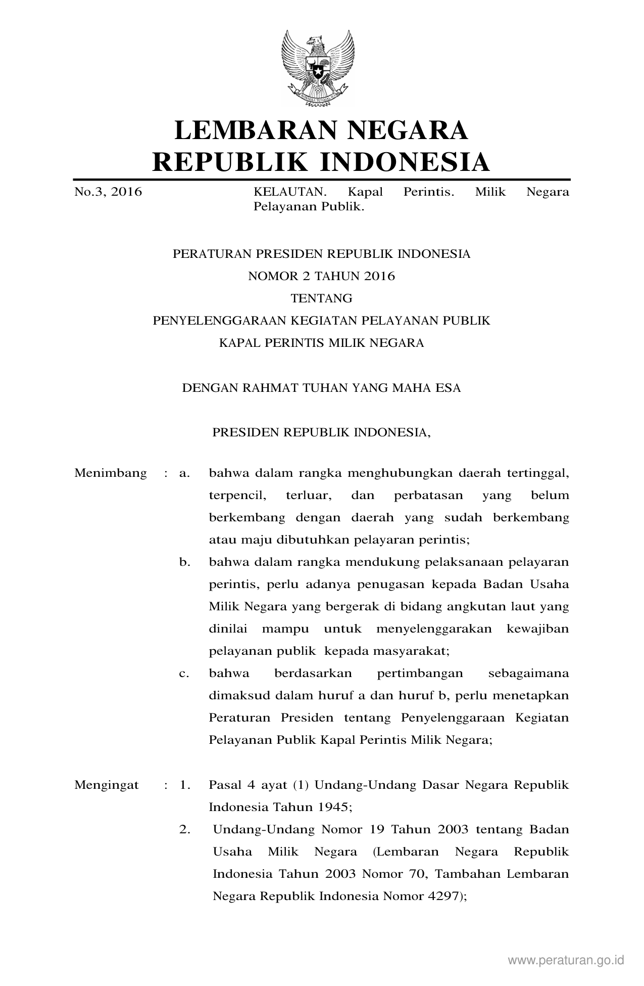 PERPRES Nomor 2 Tahun 2016 | Peraturan Presiden Nomor 2 Tahun 2016 tentang PENYELENGGARAAN KEGIATAN PELAYANAN PUBLIK KAPAL PERINTIS MILIK NEGARA