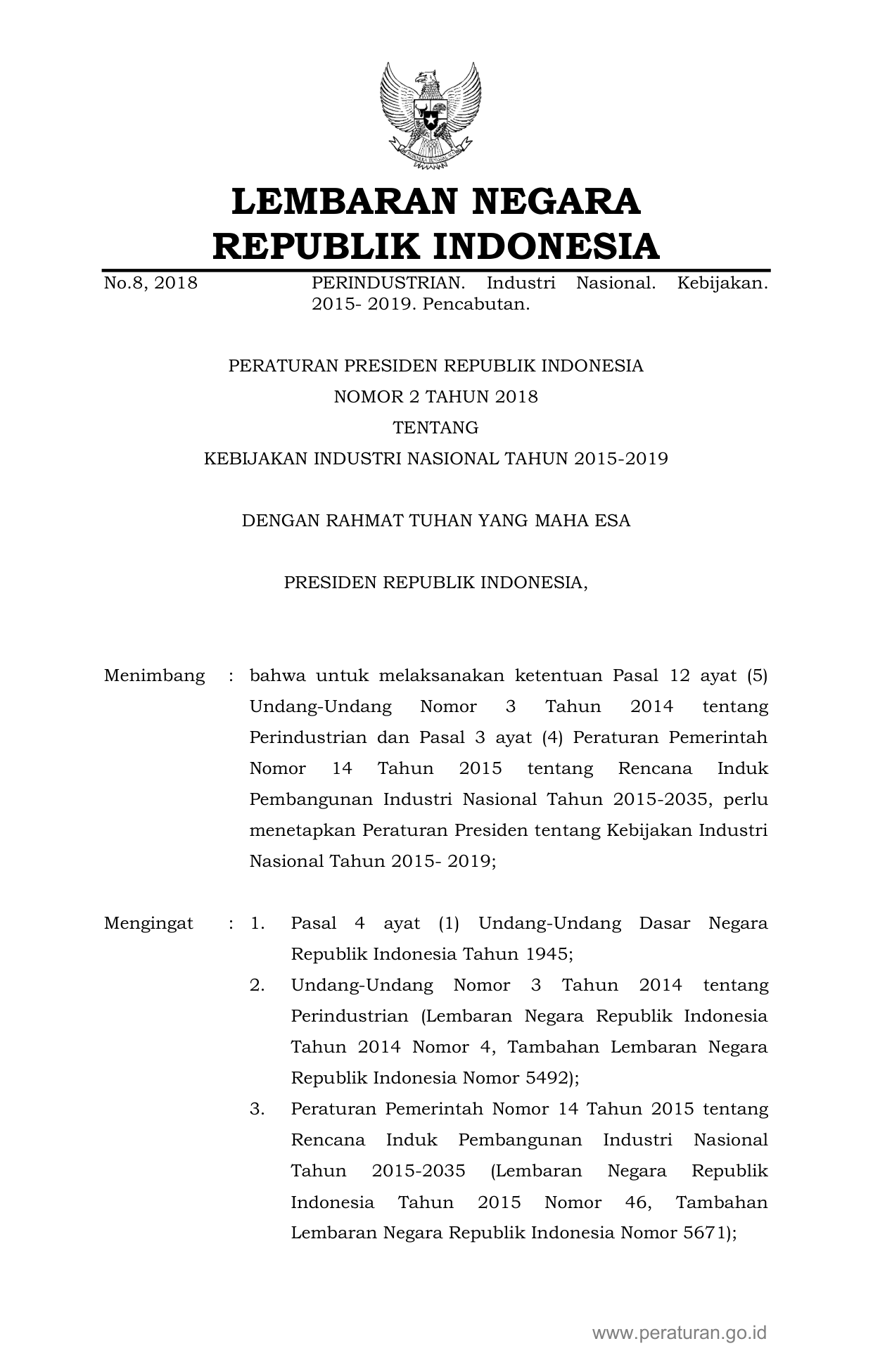 PERPRES Nomor 2 Tahun 2018 | Peraturan Presiden Nomor 2 Tahun 2018 tentang Kebijakan Industri Nasional Tahun 2015-2019