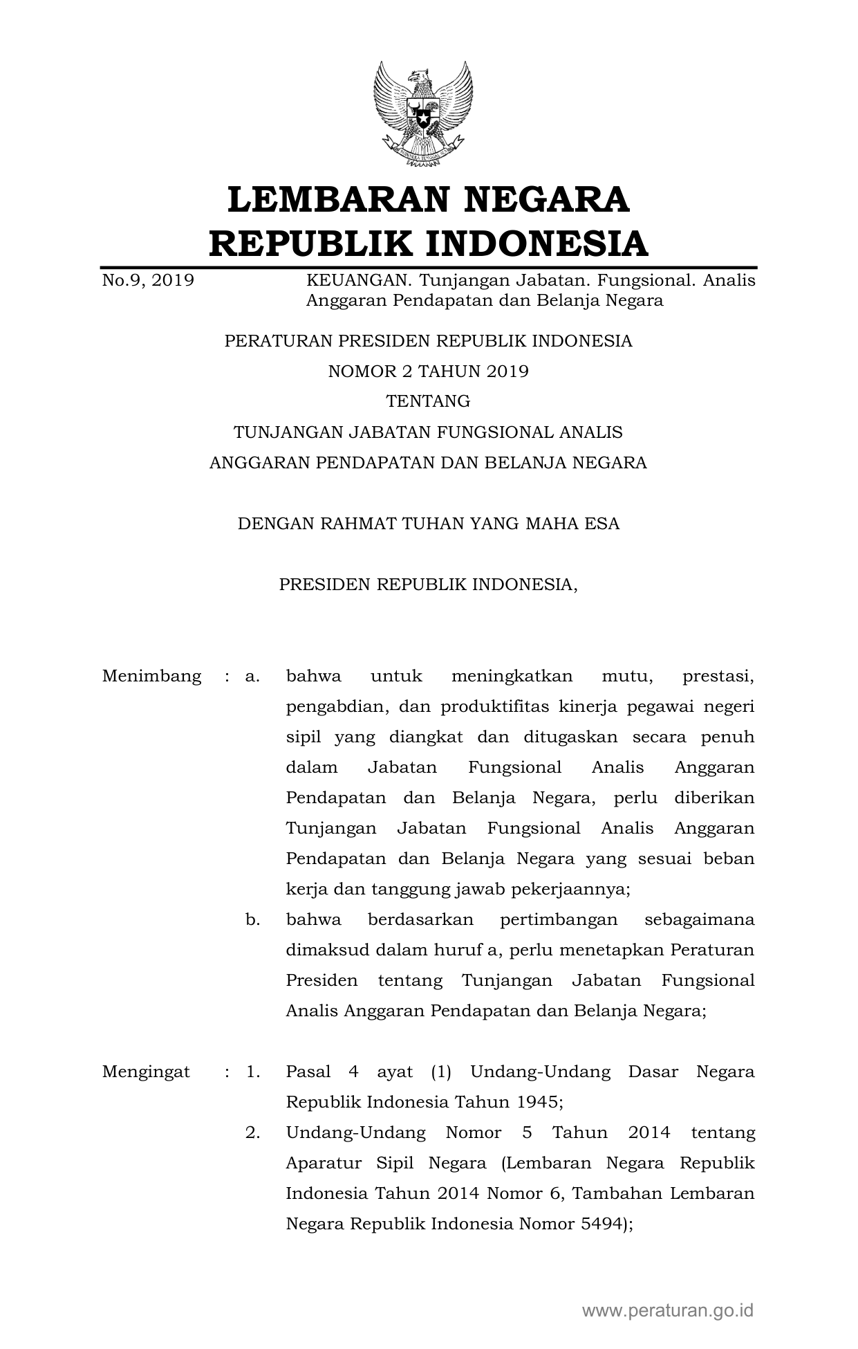 PERPRES Nomor 2 Tahun 2019 | Peraturan Presiden Nomor 2 Tahun 2019 tentang TUNJANGAN JABATAN FUNGSIONAL ANALIS ANGGARAN PENDAPATAN DAN BELANJA NEGARA