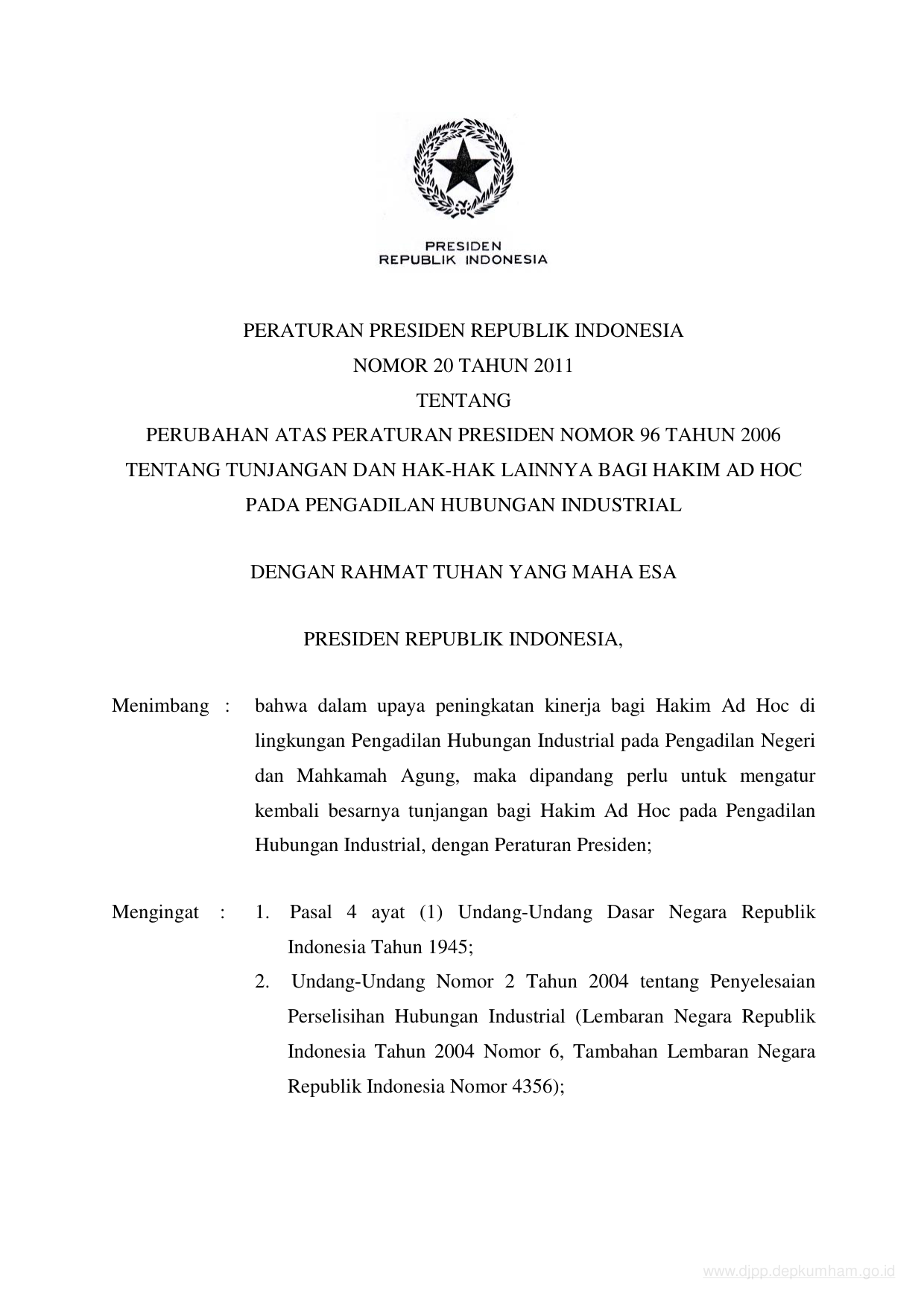 PERPRES Nomor 20 Tahun 2011 | Peraturan Presiden Nomor 20 Tahun 2011 tentang PERUBAHAN ATAS PERATURAN PRESIDEN NOMOR 96 TAHUN 2006 TENTANG TUNJANGAN DAN HAK-HAK LAINNYA BAGI HAKIM AD HOC PADA PENGADILAN HUBUNGAN INDUSTRIAL