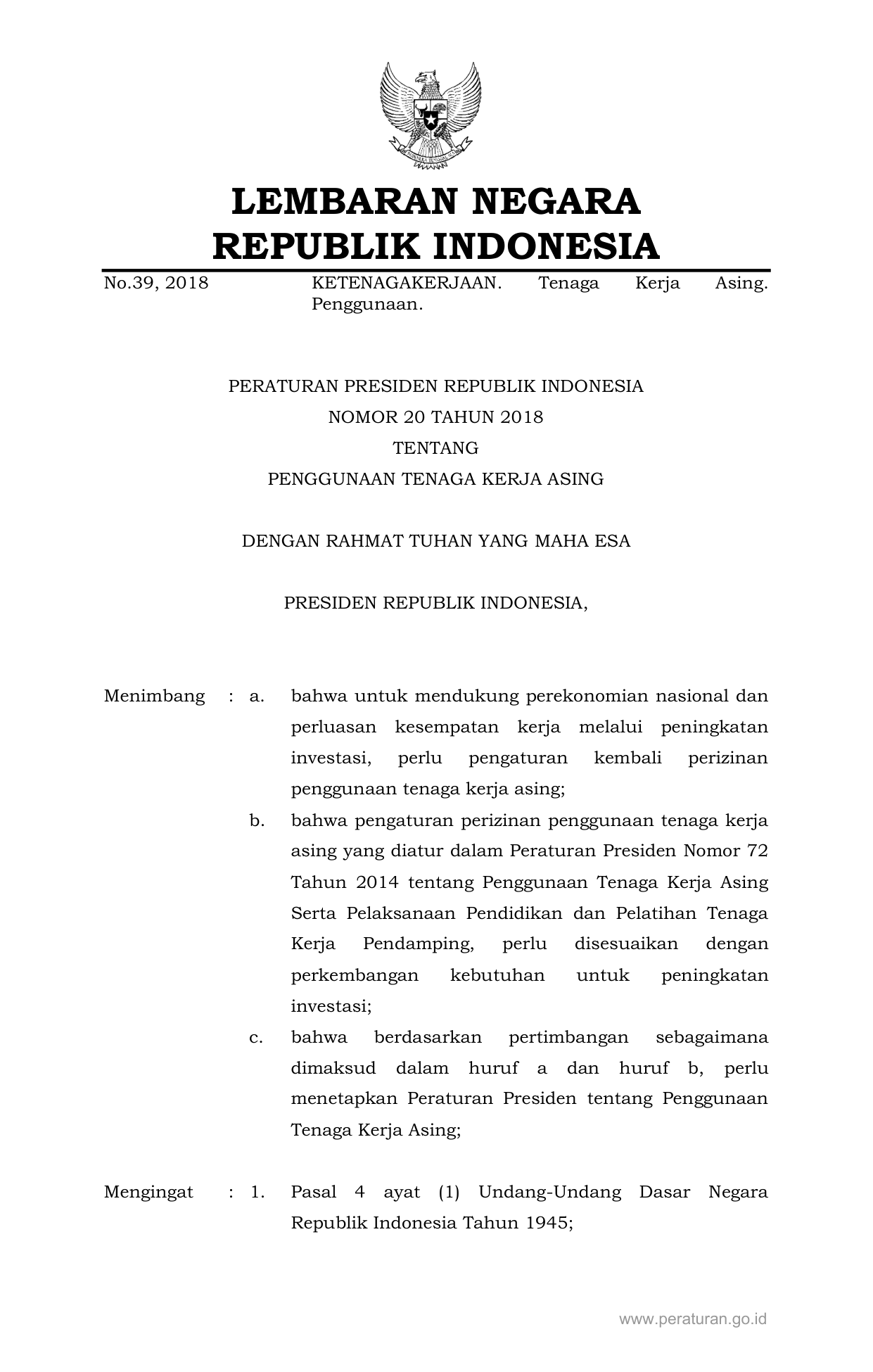 PERPRES Nomor 20 Tahun 2018 | Peraturan Presiden Nomor 20 Tahun 2018 tentang Penggunaan Tenaga Kerja Asing