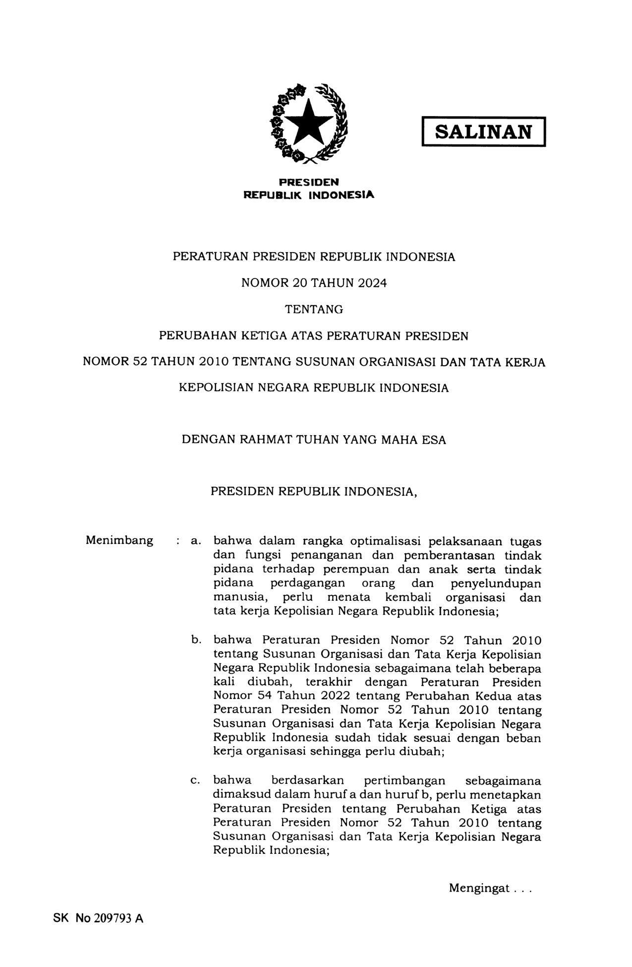 PERPRES Nomor 20 Tahun 2024 | Peraturan Presiden Nomor 20 Tahun 2024 tentang PERUBAHAN KETIGA ATAS PERATURAN PRESIDEN NOMOR 52 TAHUN 2010 TENTANG SUSUNAN ORGANISASI DAN TATA KERJA KEPOLISIAN NEGARA REPUBLIK INDONESIA