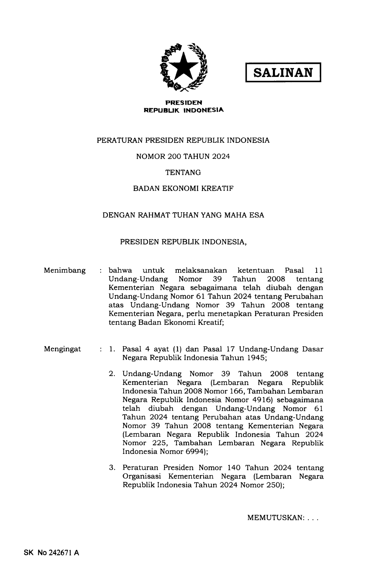 PERPRES Nomor 200 Tahun 2024 | Peraturan Presiden Nomor 200 Tahun 2024 tentang Badan Ekonomi Kreatif