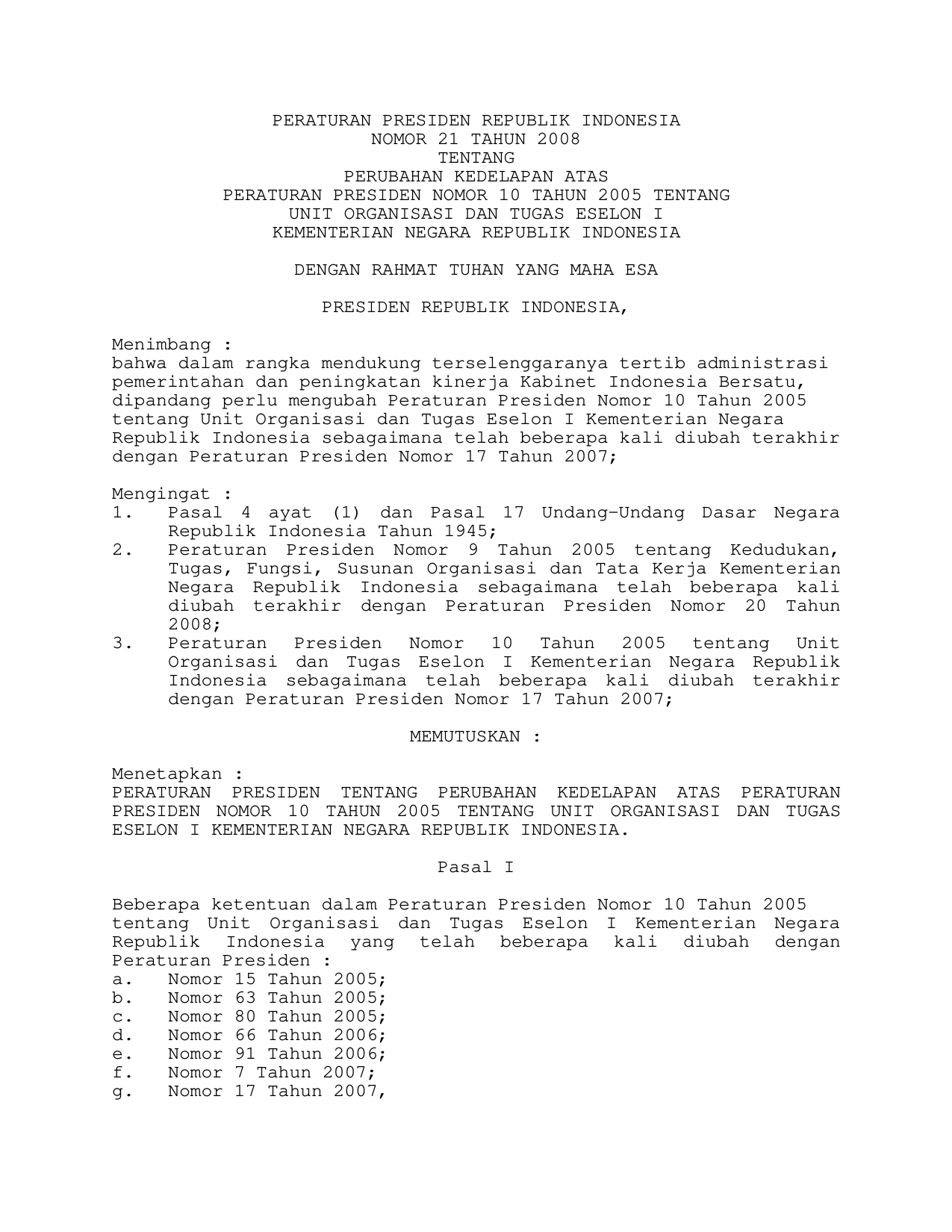 PERPRES Nomor 21 Tahun 2008 | Peraturan Presiden Nomor 21 Tahun 2008 tentang PERUBAHAN KEDELAPAN PERPRES 10-2005 TENTANG UNIT ORGANISASI DAN TUGAS ESELON I KEMENTERIAN NEGARA RI