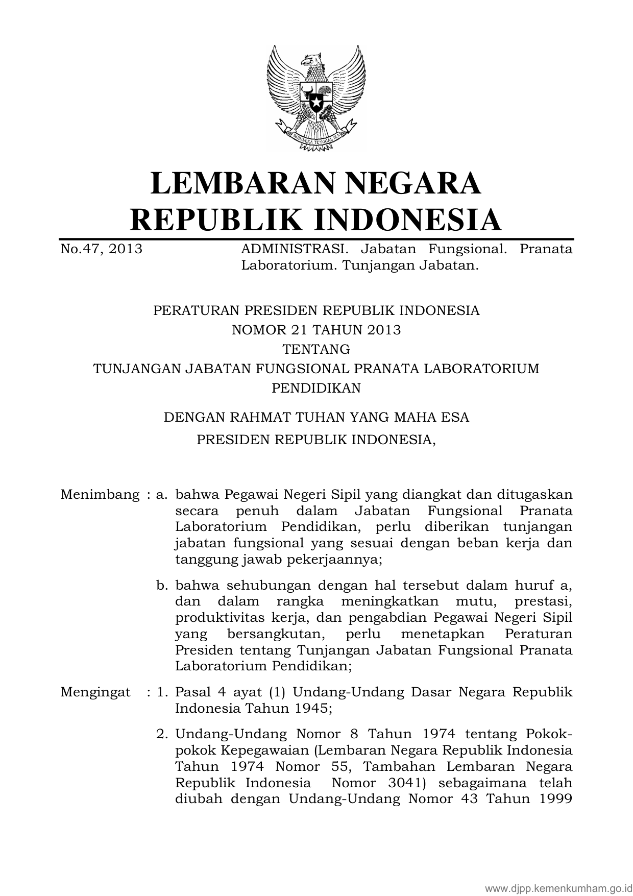 PERPRES Nomor 21 Tahun 2013 | Peraturan Presiden Nomor 21 Tahun 2013 tentang TUNJANGAN JABATAN FUNGSIONAL PRANATA LABORATORIUM PENDIDIKAN