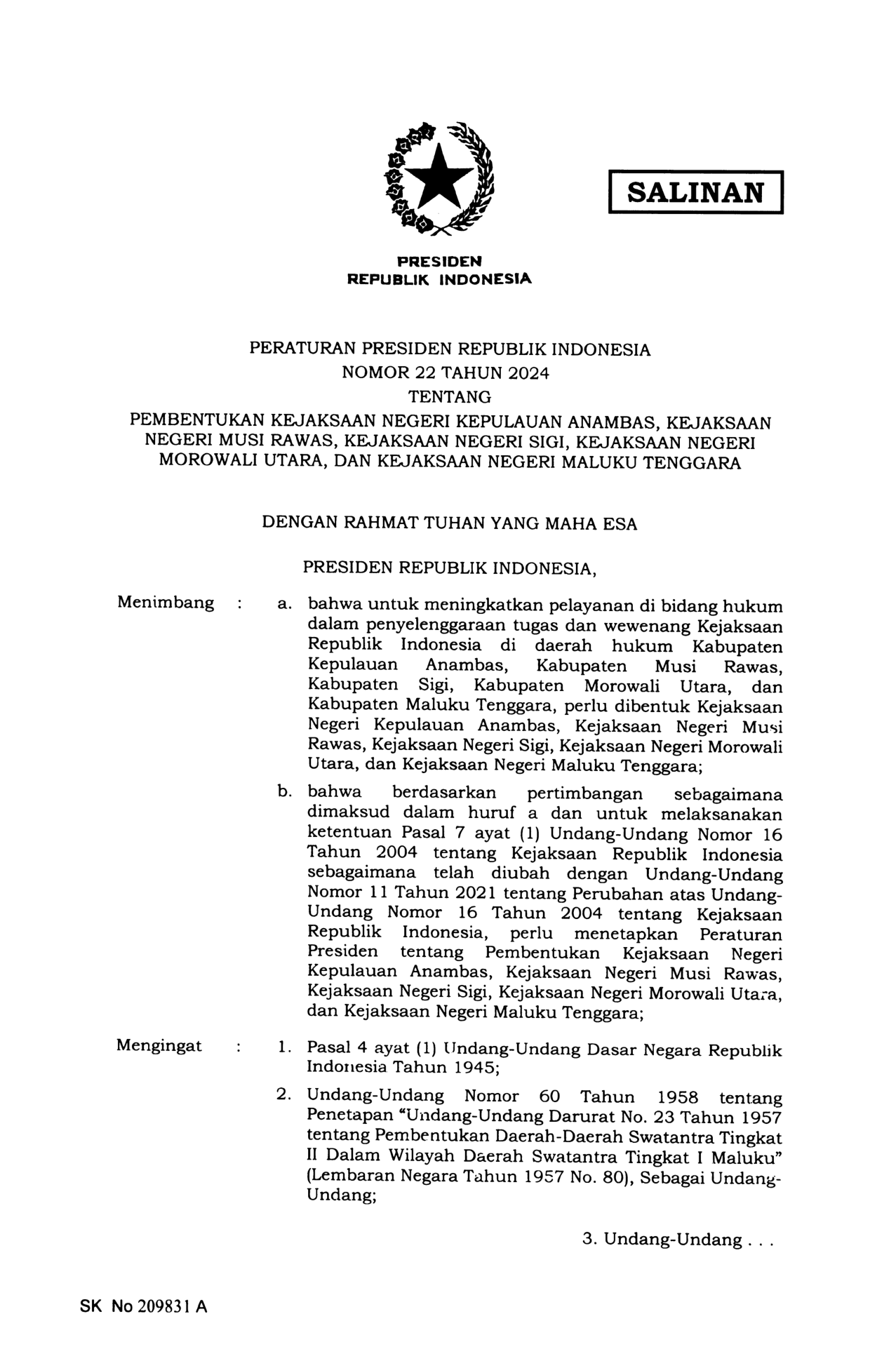 PERPRES Nomor 22 Tahun 2024 | Peraturan Presiden Nomor 22 Tahun 2024 tentang PEMBENTUKAN KEJAKSAAN NEGERI KEPULAUAN ANAMBAS, KEJAKSAAN NEGERI MUSI RAWAS, KEJAKSAAN NEGERI SIGI, KEJAKSAAN NEGERI MOROWALI UTARA, DAN KEJAKSAAN NEGERI MALUKU TENGGARA