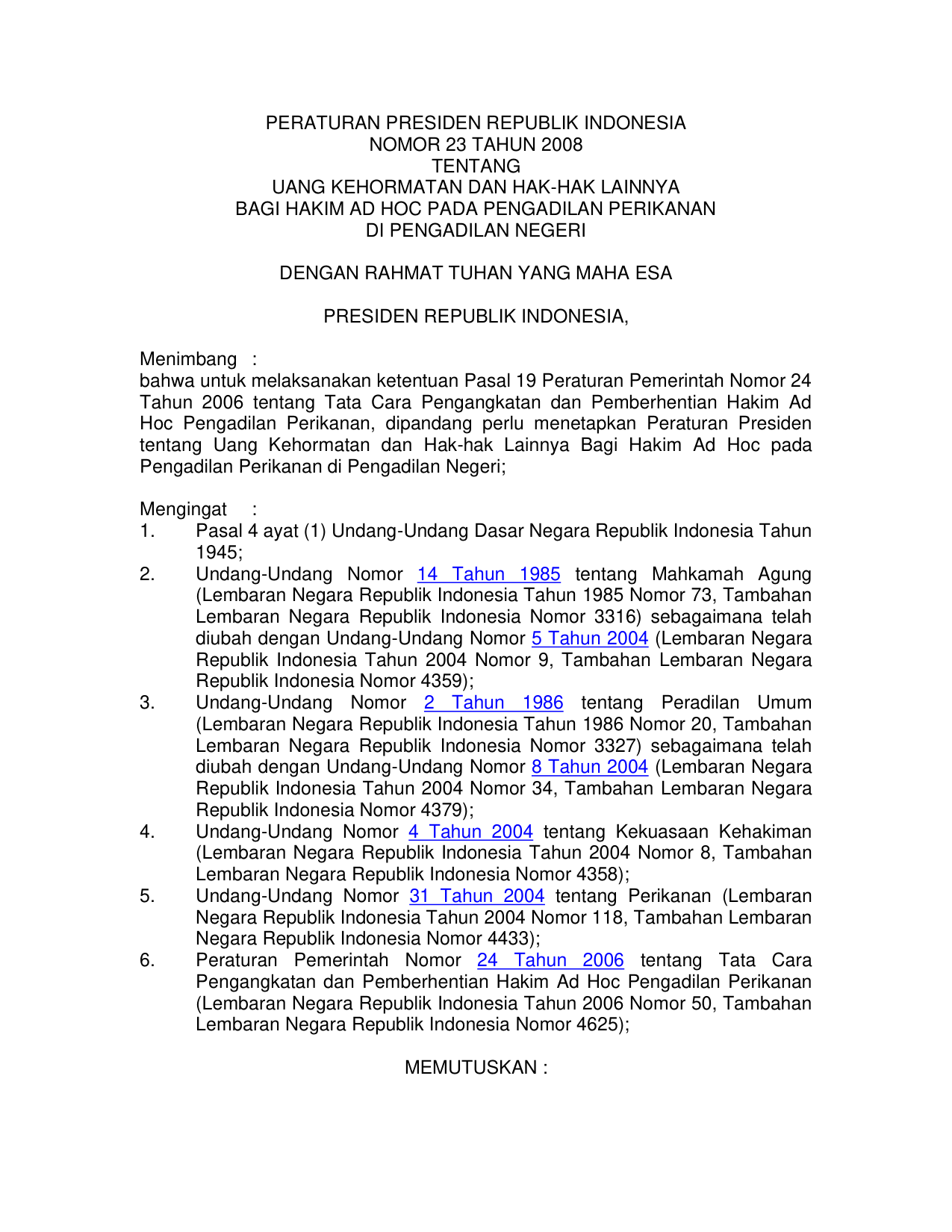 PERPRES Nomor 23 Tahun 2008 | Peraturan Presiden Nomor 23 Tahun 2008 tentang UANG KEHORMATAN DAN HAK-HAK LAINNYA BAGI HAKIM AD HOC PADA PENGADILAN PERIKANAN DI PENGADILAN NEGERI